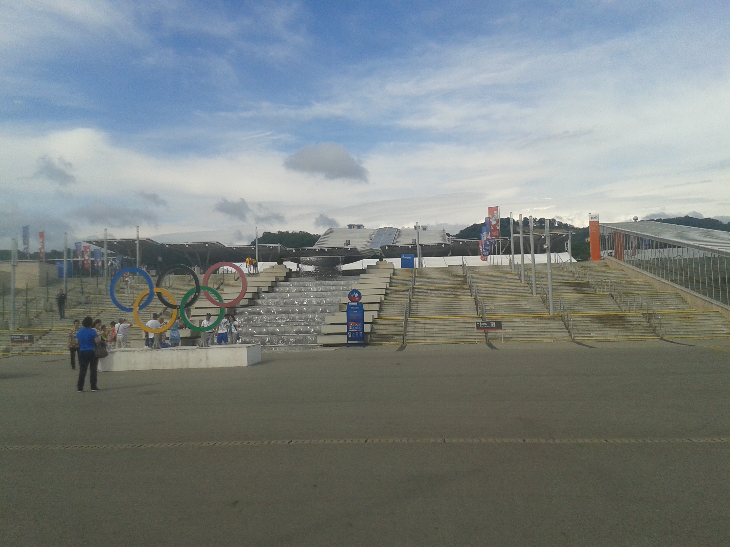 Wir ließen uns zunächst dorthin fahren und liefen den knappen Kilometer zum Hostel “Fabrika”. Kurioses Gelände, vorn am Eingang war ein Wachhäuschen, durch das man durch und nur gegen eine Hostelkarte oder Einverständnis der Rezeptionistin passieren durfte. Das Häuschen war von diversen Autoschrauber-Werkstätten rumringt und der Wachhabende kleidete sich mit einem Tarnshirt. Soldat light. Wir checkten problemlos unter Austausch einiger russischer Worte ein. Danach ging es gemütlich zum Happy Souflaki. Auch dort sprach man mit mir russisch, nachdem ich mich bemüht zeigte. Der Döner war auch nicht schlecht. Mittels FanID wurde ein Shuttlebus zum Olympischen Gelände genutzt, der aber einmal komplett um den Park herum fuhr. Insgesamt gefällt mir was Olympia-Areal richtig gut. Alles weiträumig aber gut angelegt, das Stadion mittendrin. Von einer Rennstrecke für die Formel 1 außen herum und mit schönem funktionierenden Bahnhof. Auf der anderen Seite hatte ich mit Fahrrad und Laufbegleitung den Strand und die Laufwege im letzten Jahr bereits ausgetestet. Heute stand hier später noch unser Spiel an, zunächst aber erstmal nur der Geocache an der Rennstrecke bzw. am Parkplatz davor. Der benötigte einwenig kreative Tarnung aber die nebenan stehenden Polizisten nahmen mir wohl ab, dass es nur um ein Foto ging. Keine Gefahr.