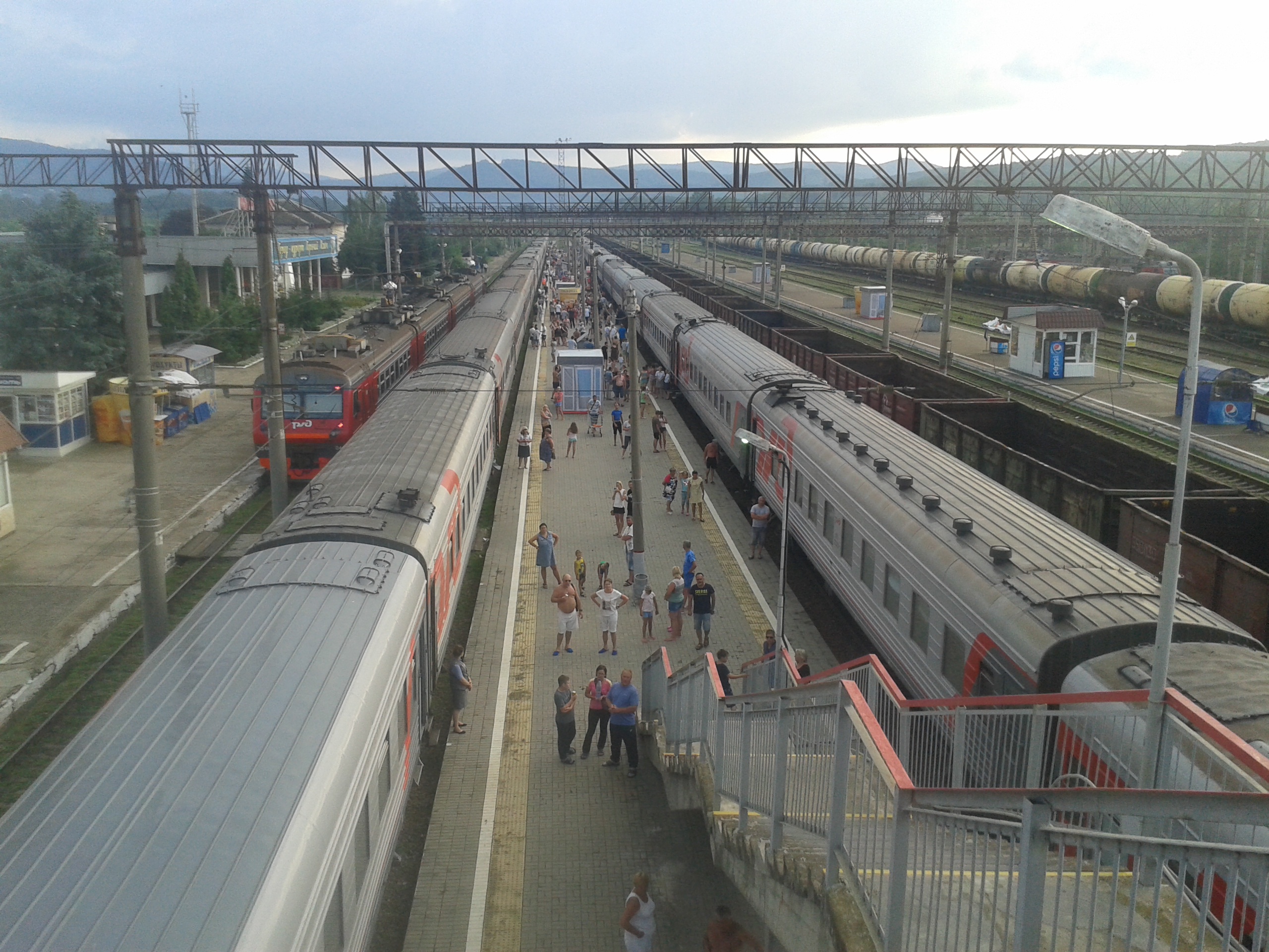 Mit der Elektritschka sollte es zurück zum Bahnhof Adler gehen. Die Ausstellung eines Tickets ging erneut mit FanID problemlos. Weil irgendein Held im Automaten 14 Rubel vergessen hatte, zog ich mir eine Flasche für die verbliebenen 46 Rubel aus der CocaCola Maschine, während die umliegenden Pachtstände 110 Rubel haben wollten. So macht die FIFA Märkte kaputt oder Geiz ist geil oder sowas. Die Bahn brachte uns zurück zum Hauptbahnhof in Adler, wo wir die eintreffende zweite Hälfte der Reisegruppe in Empfang nahmen.