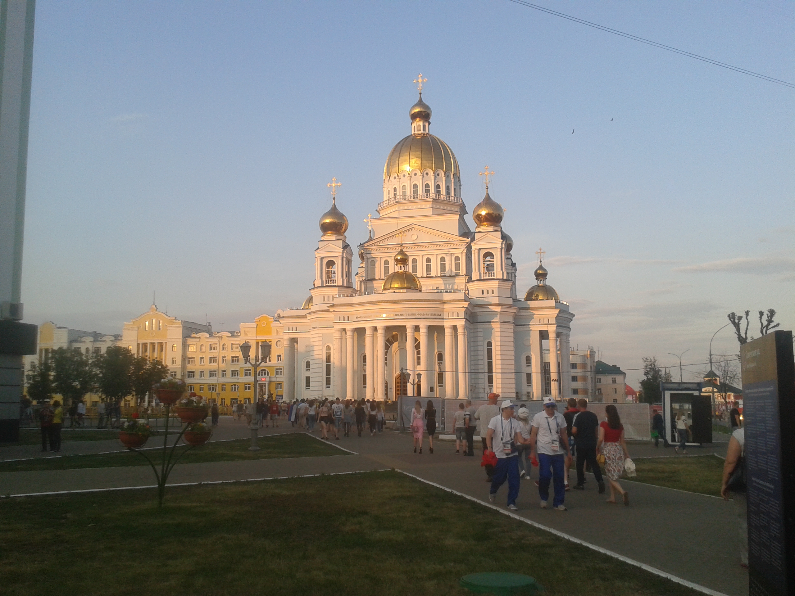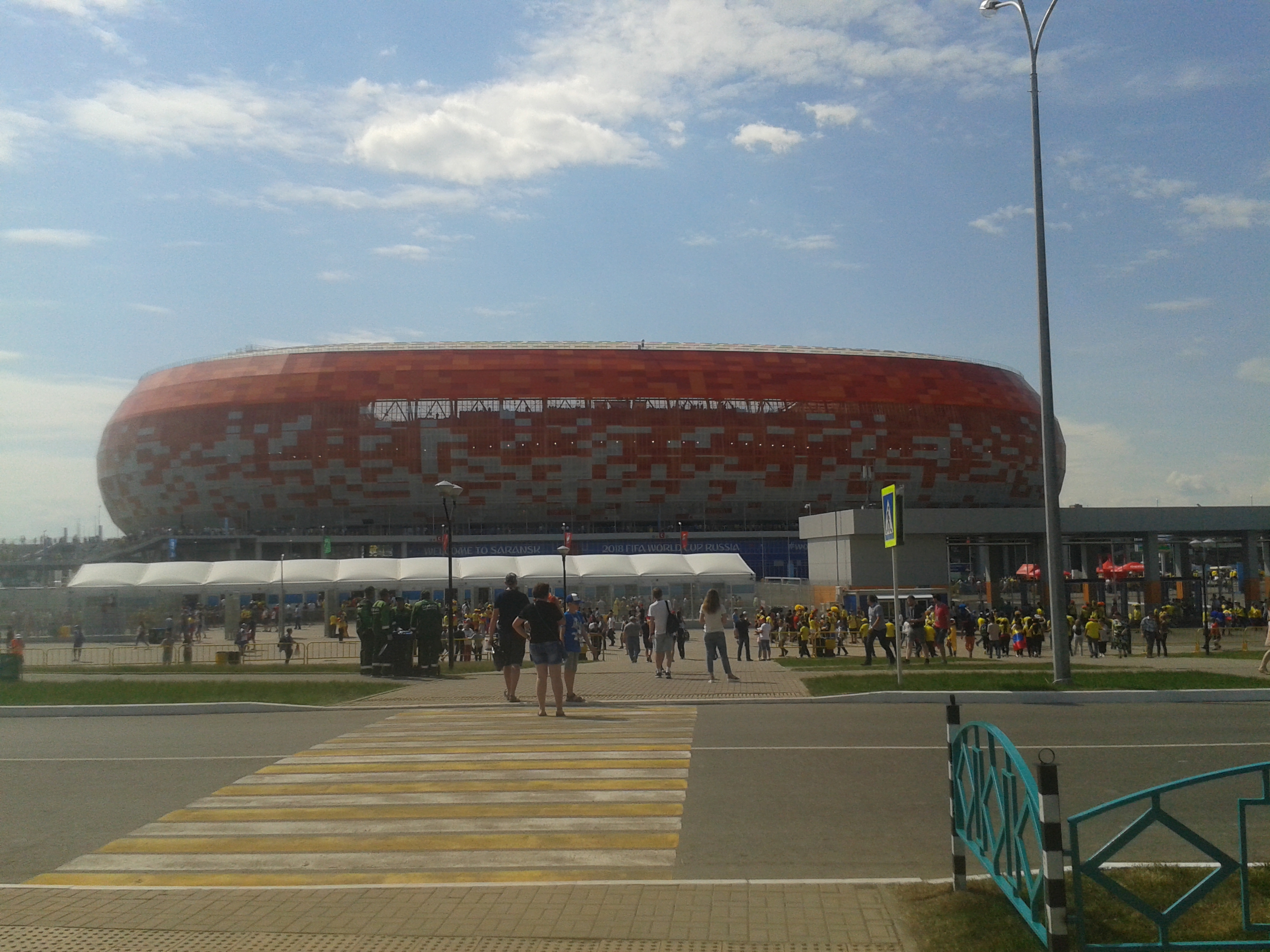Dort wurde um 3:15 Uhr morgens bei klar hellblauem Himmel umgestiegen. Den zweiten Teil der Fahrt brachten wir im Kupe rum. Morgens um zehn kamen wir bei bereits ordentlichen Umgebungstemperaturen in Saransk an. Die Luft war warm und trocken. Mit uns zusammen stolperten auch einige Kolumbianer aus dem Zug. Wir fanden uns an einer Bushaltestelle ein und nahmen per Linienbus die Route, die uns in die Nähe der Unterkunft führen sollte. Beim Durchqueren machte die Stadt einen sehr gepflegten Eindruck, zumindest dort wo der Bus auf einer breiten Straße durchs Zentrum und vorbei an einem Neubaugebiet fuhr, wo wir dann auch schonmal einen Blick auf das optisch mit der Umgebung passende Stadion werfen konnten. In der angepeilten Straße angekommmen, leitete uns eine freundliche Babuschka den Weg und ich durfte einmal nett mit der Vermieterin telefonieren. Diese wartete dann auch an der endlich angefundenen Adresse auf uns. Da wir statt mit drei angekündigten Personen, nun aber tatsächlich zu sechst in der Wohnung standen, entstanden ein paar Verwirrungen und es war gar nicht so einfach, die Situation mit begrenzten sprachlichen Fähigkeiten aufzulösen. Am Ende zahlten wir 2000 Rubel drauf und alles war wieder in Ordnung. Jeder sortierte etwas sein Gepäck und nahm eine frische Dusche. Ein kurzer Einkauf beim nahegelegenen Mini-Markt folgte und der Proviant wurde heim getragen. Dieser kleine ganz, nur 400 Meter weit, reichte bereits um den Nutzen der Dusche zunichte zu machen.