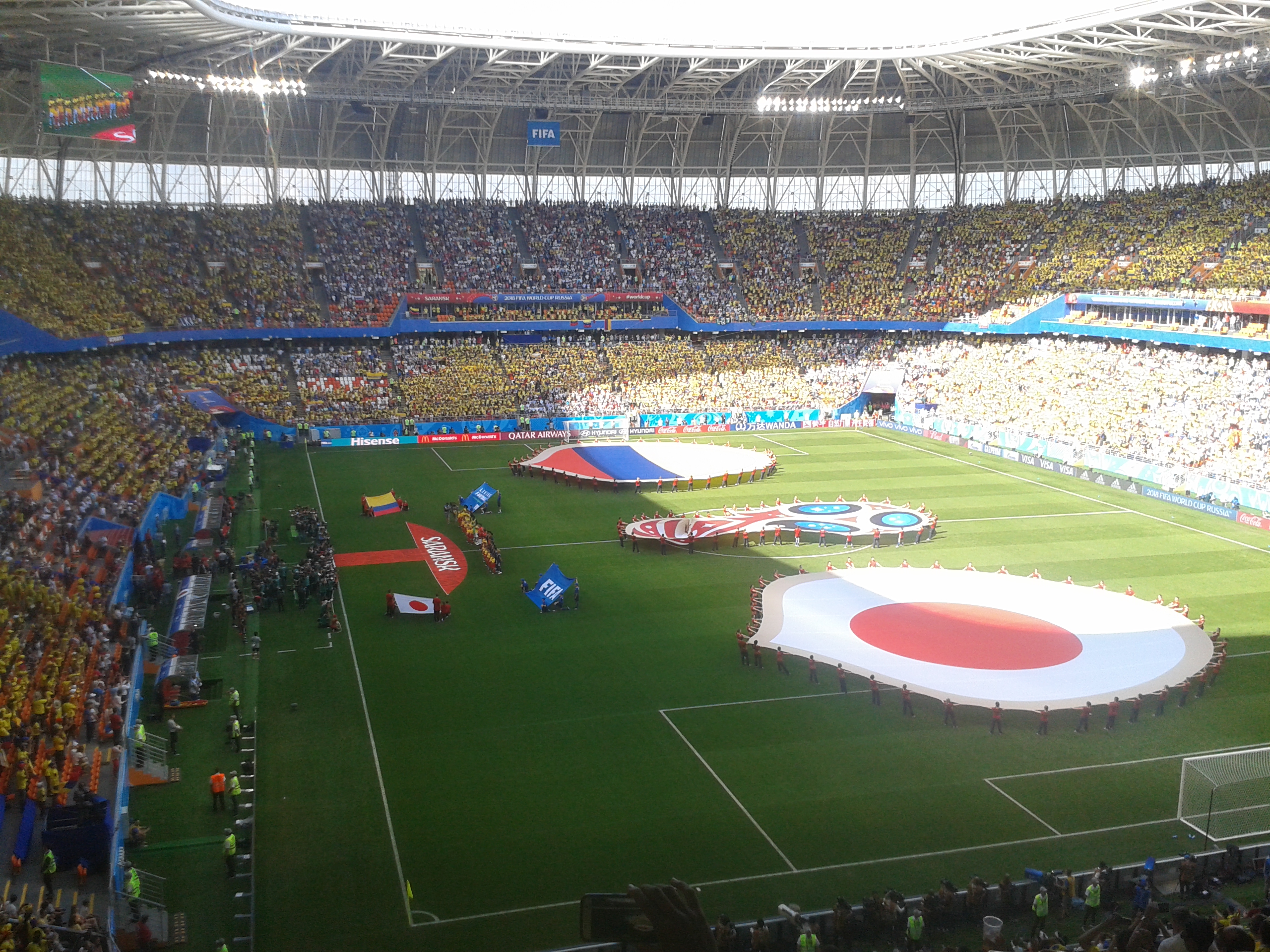 Da Saransk touristisch nicht viel zu bieten hat und das Spiel bald beginnen sollte, machten wir uns auf zur Bushaltestelle. Von dort fuhr uns ein Linienbus direkt bis an die FIFA-Sperrzone des Stadions heran. Die Gegend sah echt skuril aus. Entweder waren die eckigen Häuser in dieser großzügigen Anlage frisch hochgezogen oder frisch angestrichen worden. Während der morgendlichen Busfahrt war bereits aufgefallen, dass die Häuser der Wohnblöcke in Stadionnähe sehr der Farbgebung angeglichen waren. Je weiter man raus kommt, desto abgewohnter und grauer wirkte alles. Wir liefen eine breite Straße mit Park-Grün-Streifen, schnurstracks aufs Stadion zu. Die runde Konstruktion machte einen imposanten Eindruck für eine 40-tausender Hütte. Aber es hatte auch etwas besonderes durch das recht weitläufige Umfeld. Außen herum war alles durch die Besucher in gelb getaucht, man konnte nur wenig andersgekleidete Menschen ausmachen. Auch innerhalb der 4-Tribünen-Arena war Kolumbien geradezu übermächtig vertreten, optisch natürlich. Zur Hymne waren die Kolumbianer ordentlich wach und es trieb mir sauber das Kribbeln unter die Haut.
