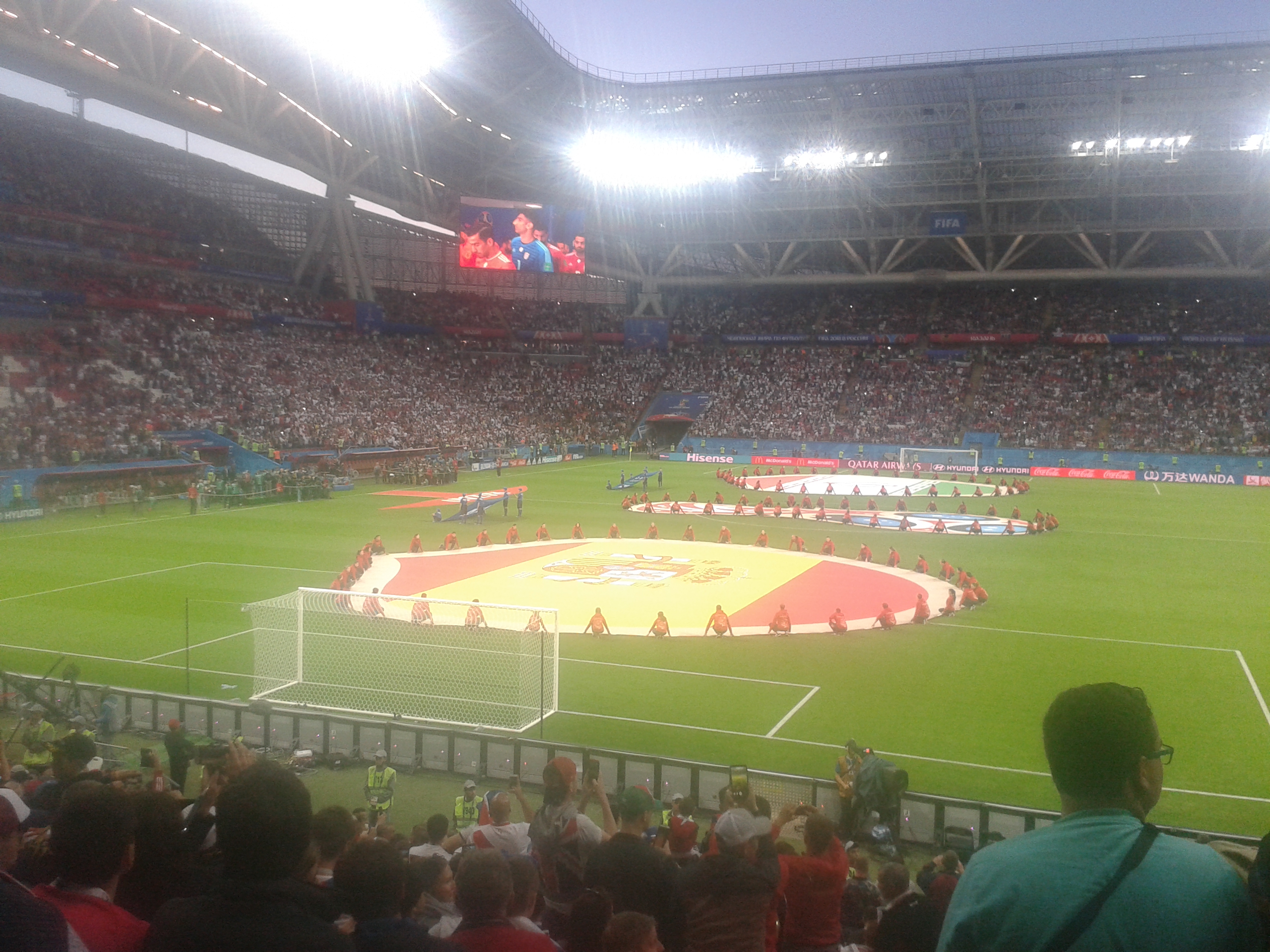 Der Marsch um den letzten Häuserblock herum enthüllte nun auch den Blick auf das verunstaltete Stadion. Das eigentlich recht nette Rund, eine Arena auf dem Sockel eines älteren Stadions wurde auf beiden Hintertorseiten von extrem hässlischen Stahlrohrtribünen optisch vergewaltigt. Auf den Seiten waren auch die Außenverblendungen entfernt worden. Die fügte dem Stadion nochmals eine unanschauliche Perversion zu, die man von der FIFA bisher nur aus Sao Paulo kannte. Scheinbar war es irgendwem sehr wichtig, dass dieser Spielort im asiatischen Teil Russlands unbedingt beim Turnier dabei ist. An der Kontrolle wurde diesmal mein Deo beanstandet. Was bei den bisherigen Spielorten kein Problem war, ist in Asien wohl eine Gefahr für andere Menschen. Eine Ausführung/Weiterführung des Gedanken lass ich mal an dieser Stelle sein, ich meine mich im Beitrag zum Achtelfinale 2014 in Porto Alegre dazu geäußert zu haben.