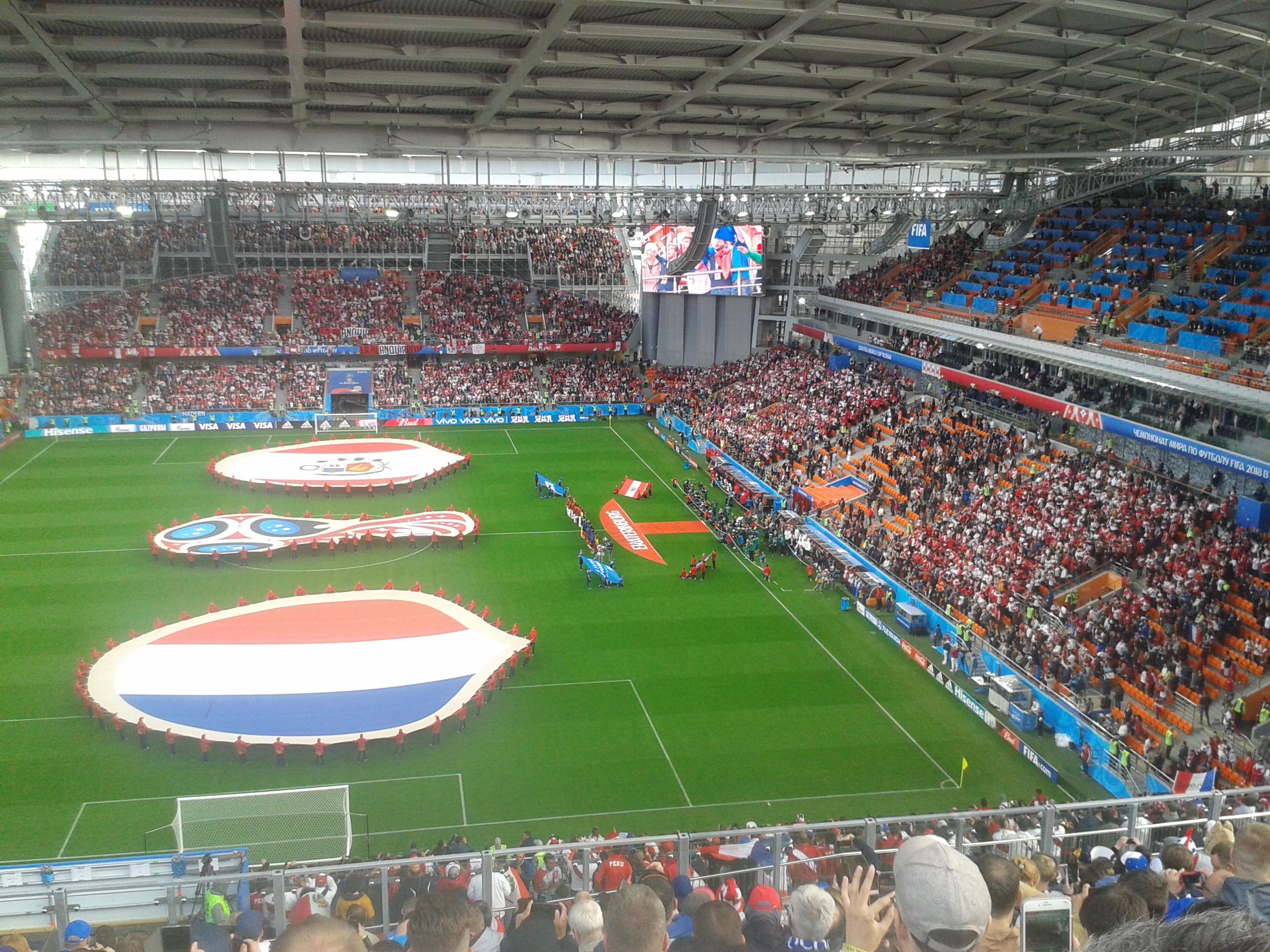 Die Peruaner machten gescheit Stimmung, von Frankreich kam nicht viel. Etwa 70 zu 15 Prozent im Verhältnis, der Rest waren neutrale Zuschauer. Die Leidenschaft auf dem Rasen teilte sich genauso auf. Die mutigen Peruaner waren stark engagiert, kamen aber technisch kaum an die Franzosen heran. Frankreich beschränkte sich auf die Spielverwaltung aus defensiver und Mittelfeldarbeit. Ihnen reichten ein einziger sehenswerter Spielzug zum Siegtreffer. Peru wurde für seinen Aufwand nicht belohnt und schied somit vorzeitig aus der WM aus. Zum Ende des Spiels wurde es auf unserer Tribüne dank fehlender Überdachung durch einsetzenden Niesel etwas ungemütlich. Der Tag hatte ja eh schon nicht durch gute Temperaturen überzeugt. Insgesamt war es schon sehr frisch hinterm Ural.