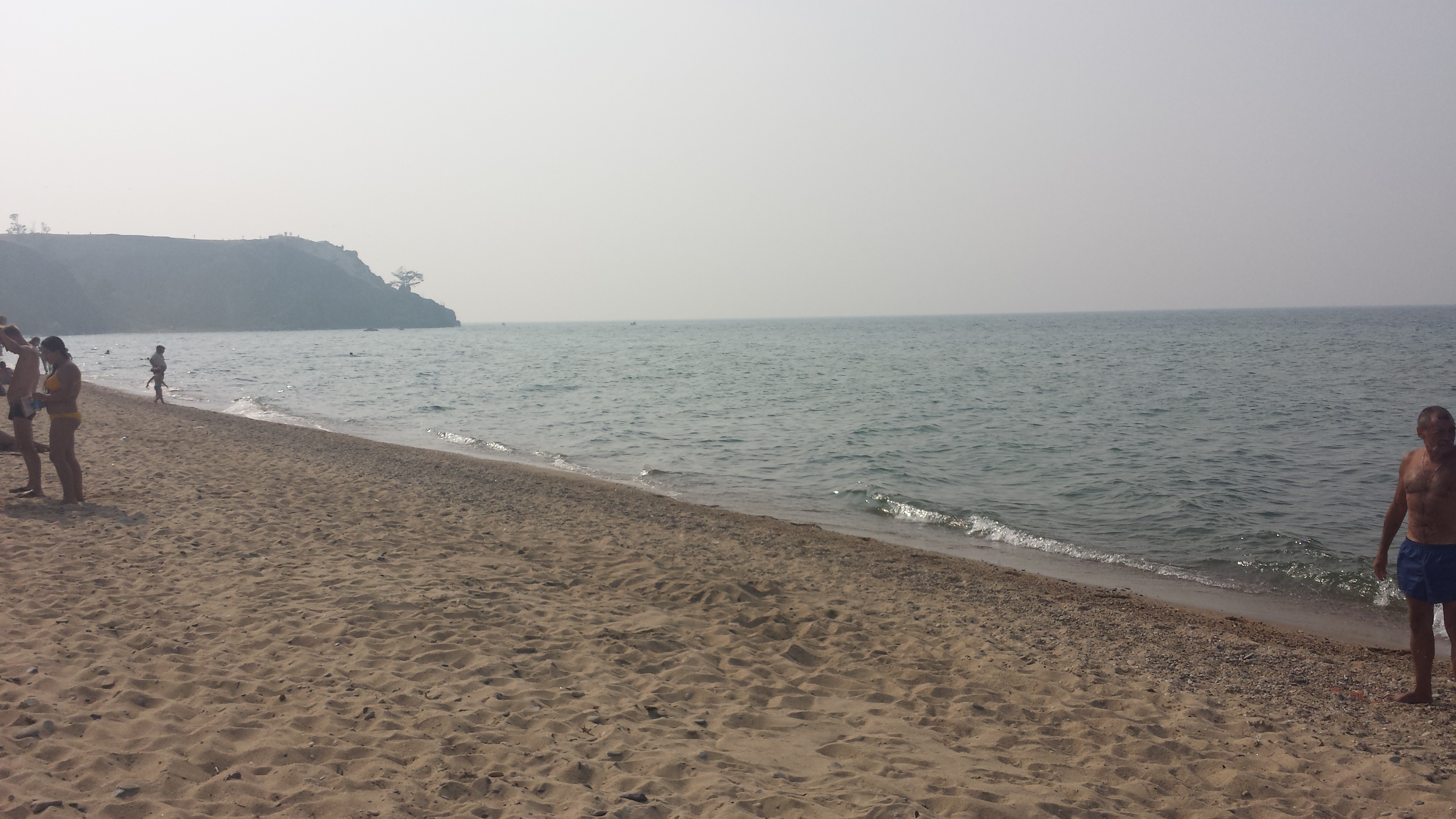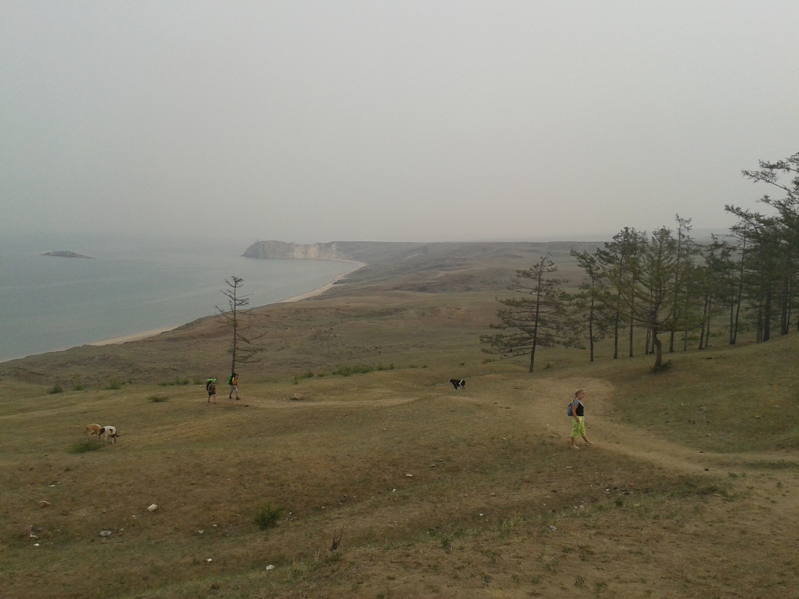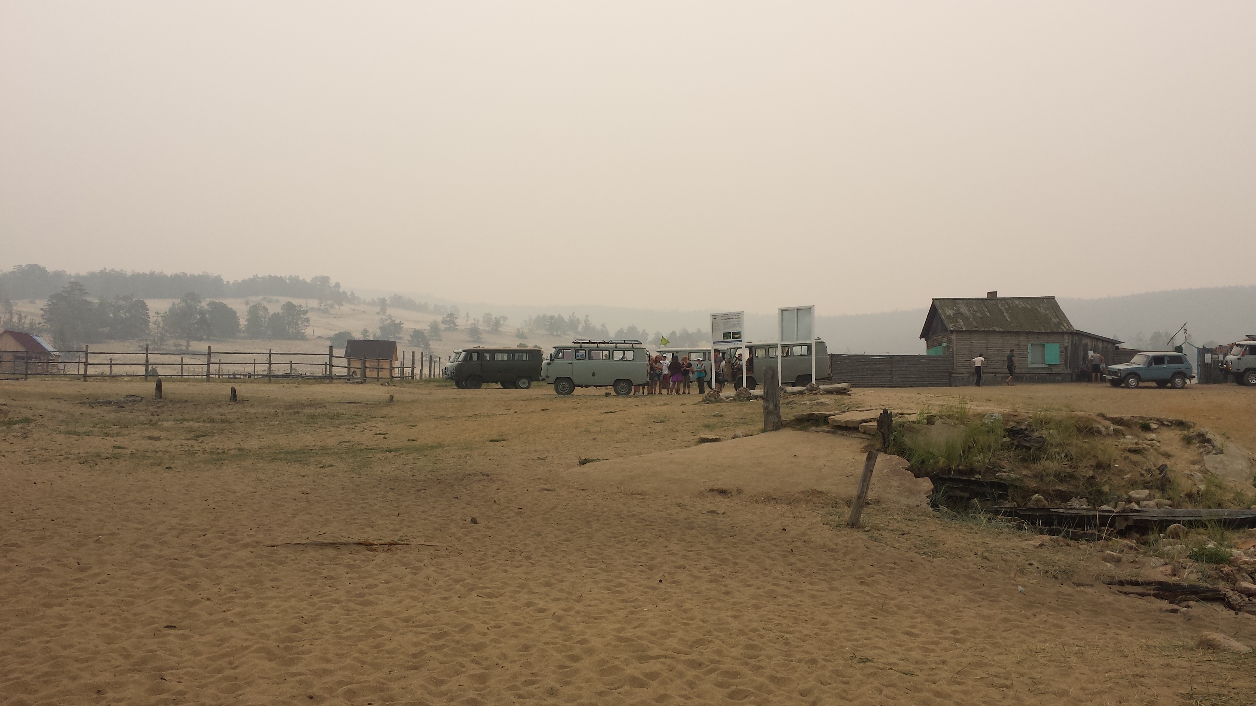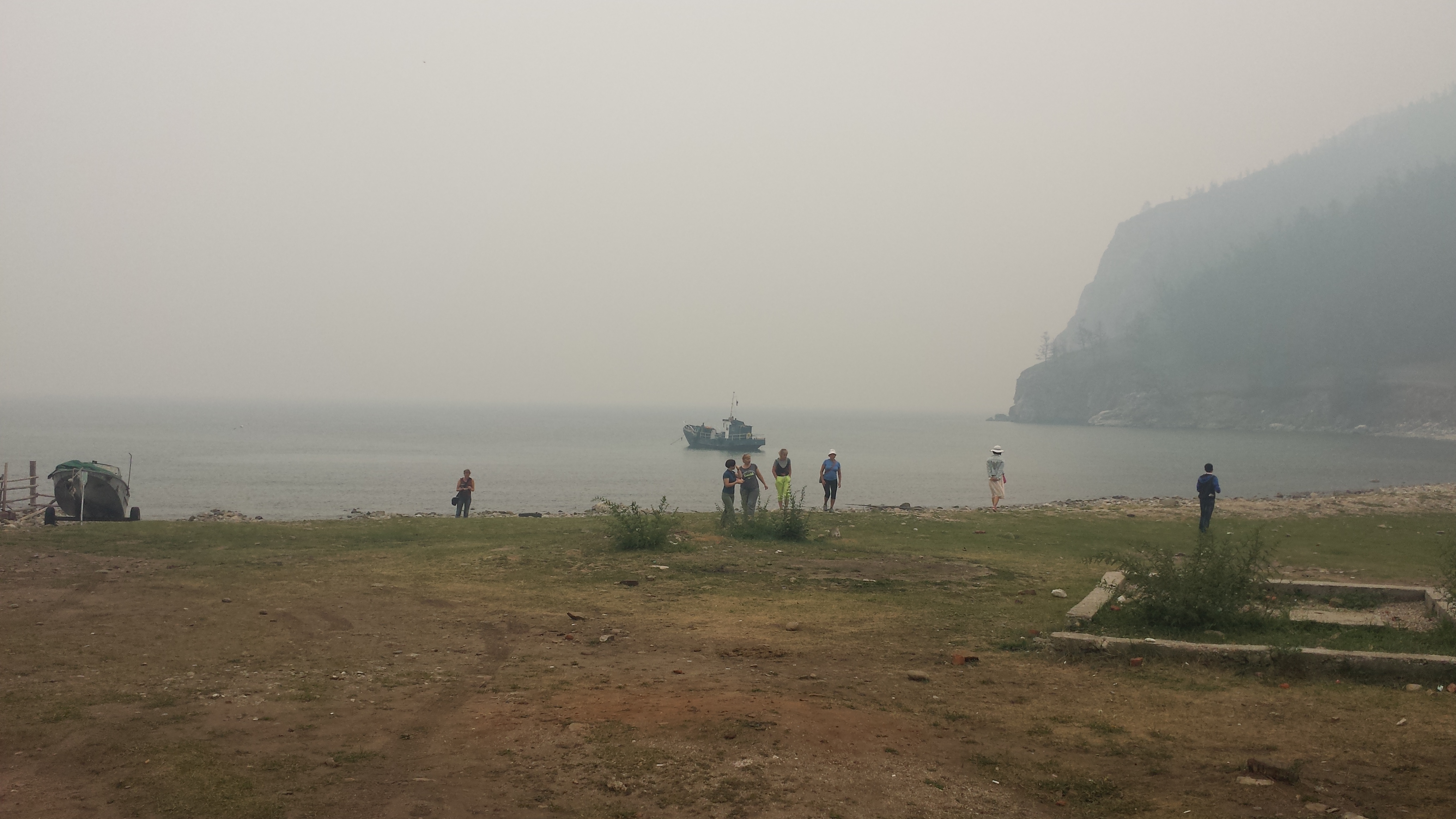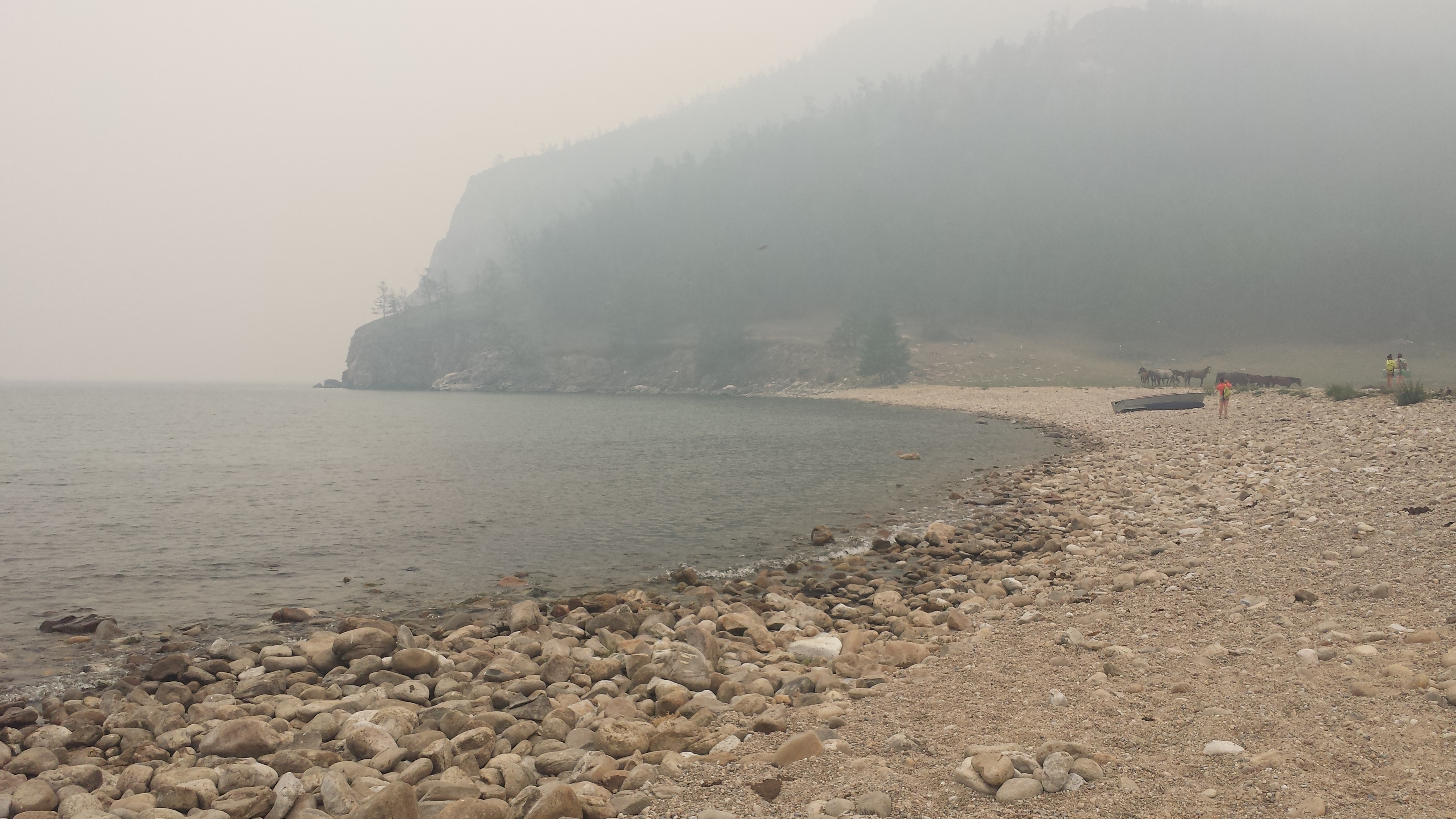 Auf dem Rückweg nach Khuzhir fuhr unser Bus den westlichen Teil der Küste ab und wir passierten zwei große Berge, deren Umrisse wir durch den Rauch nur erahnen konnten. Hier war das Land viel grüner und grasiger. Eine Pferdeherde stand unweit des steinigen Seeufers auf einer Weide. Ein kleines Fischerboot lag 100 Meter vom Ufer entfernt vor Anker. Es war schon ziemlich malerisch hier.