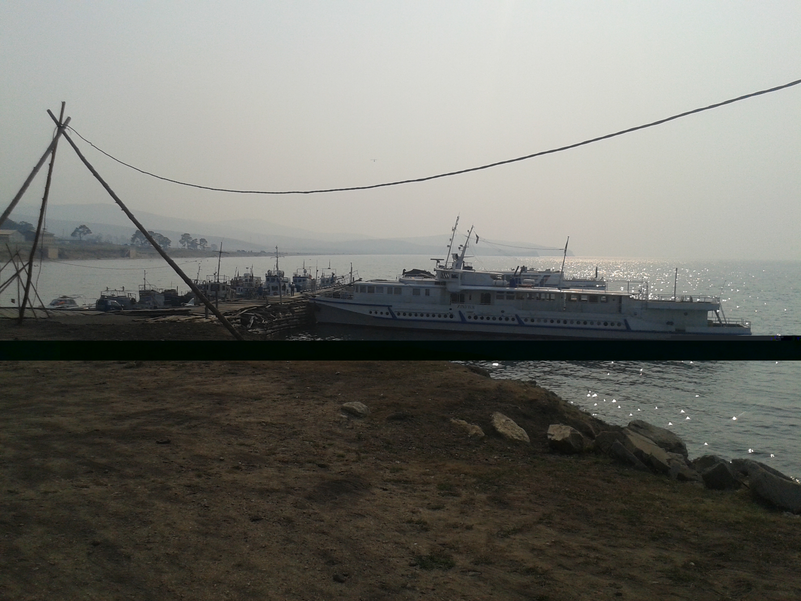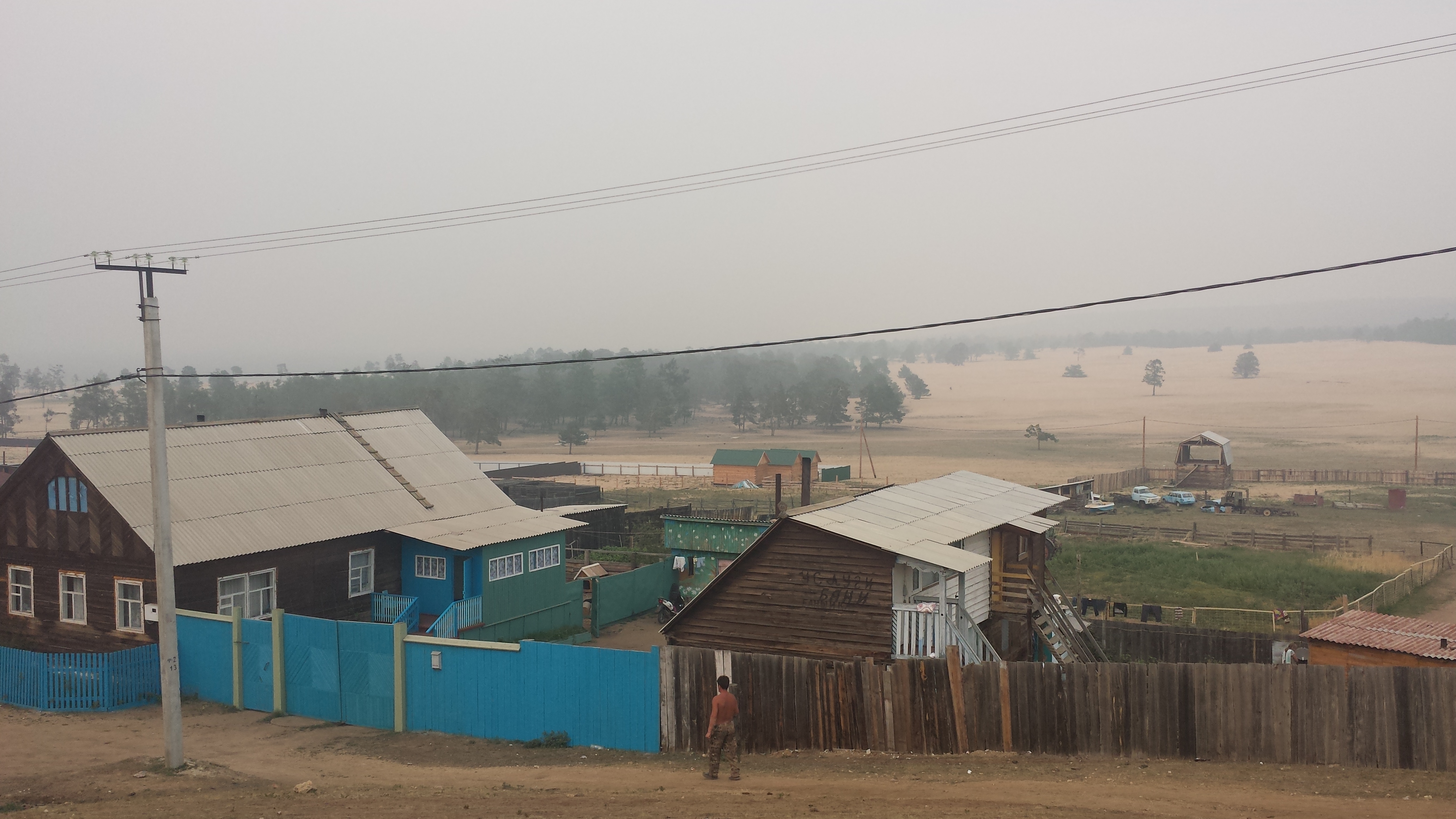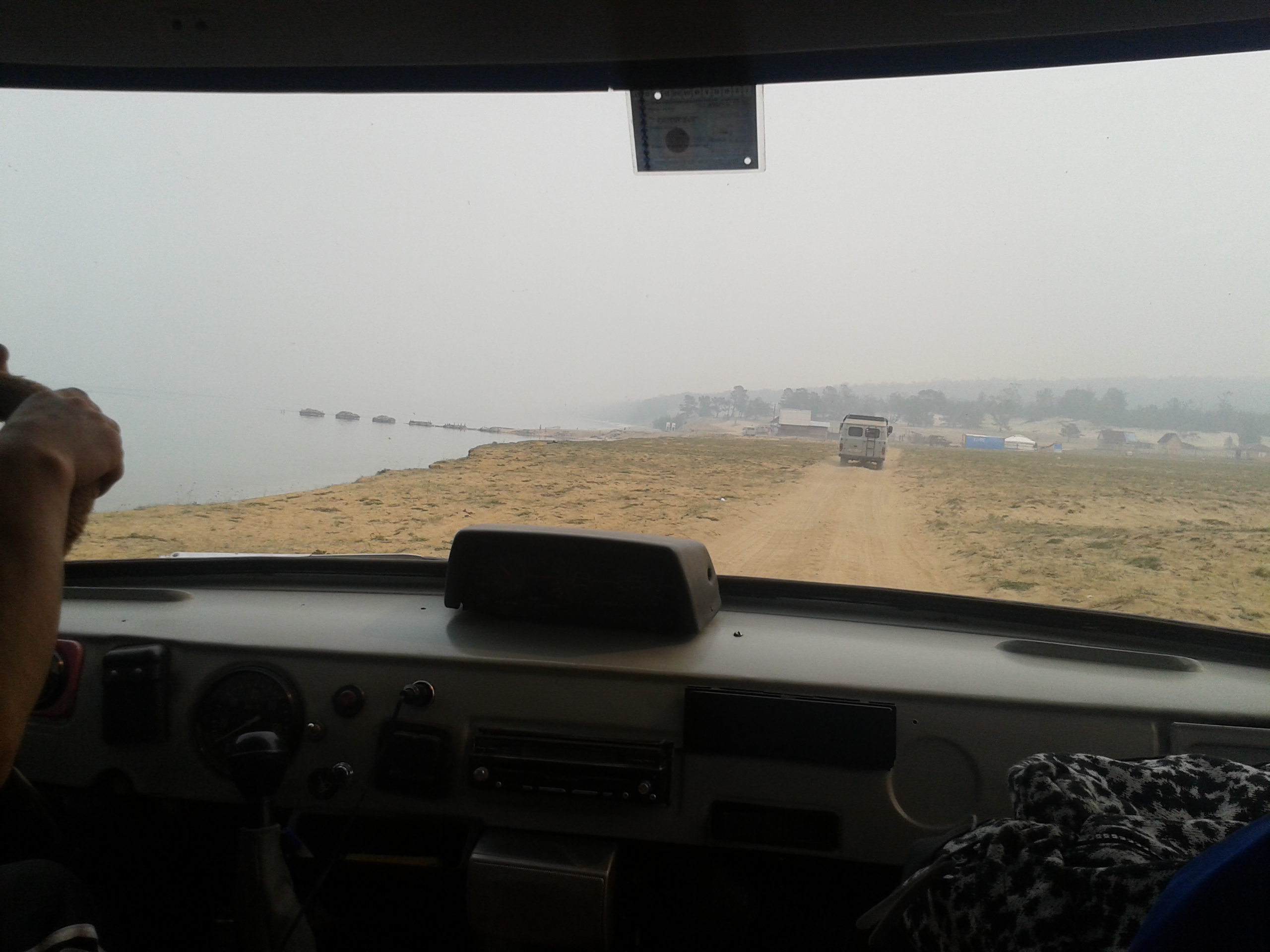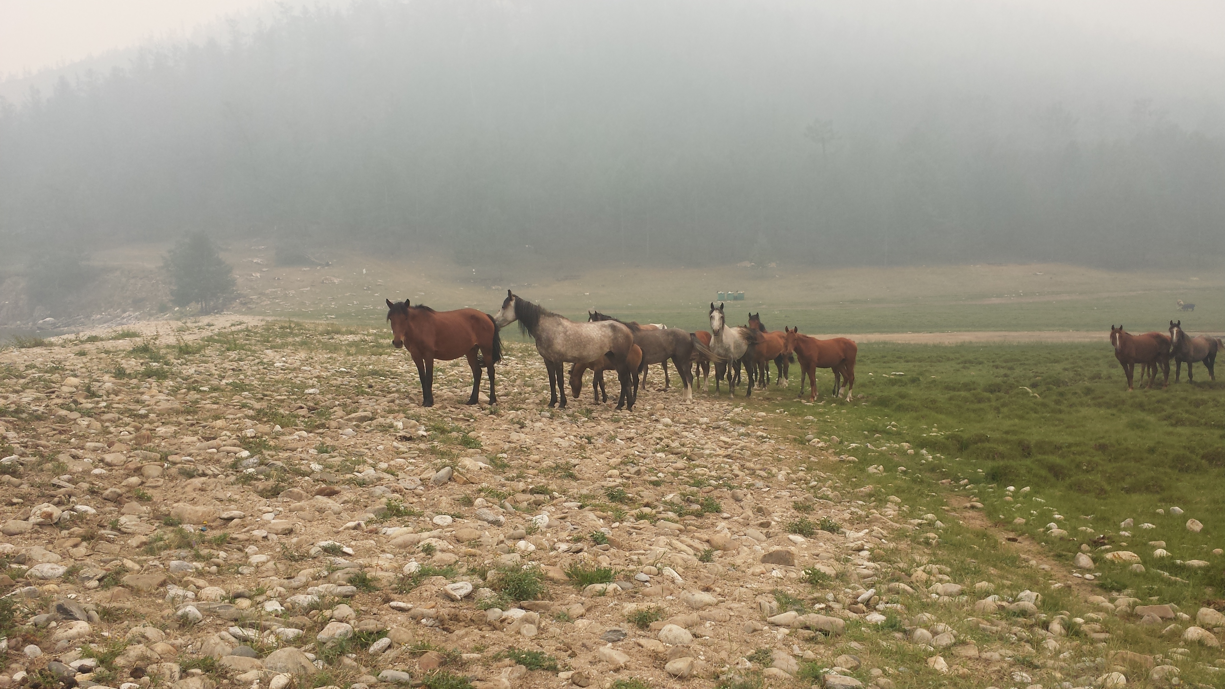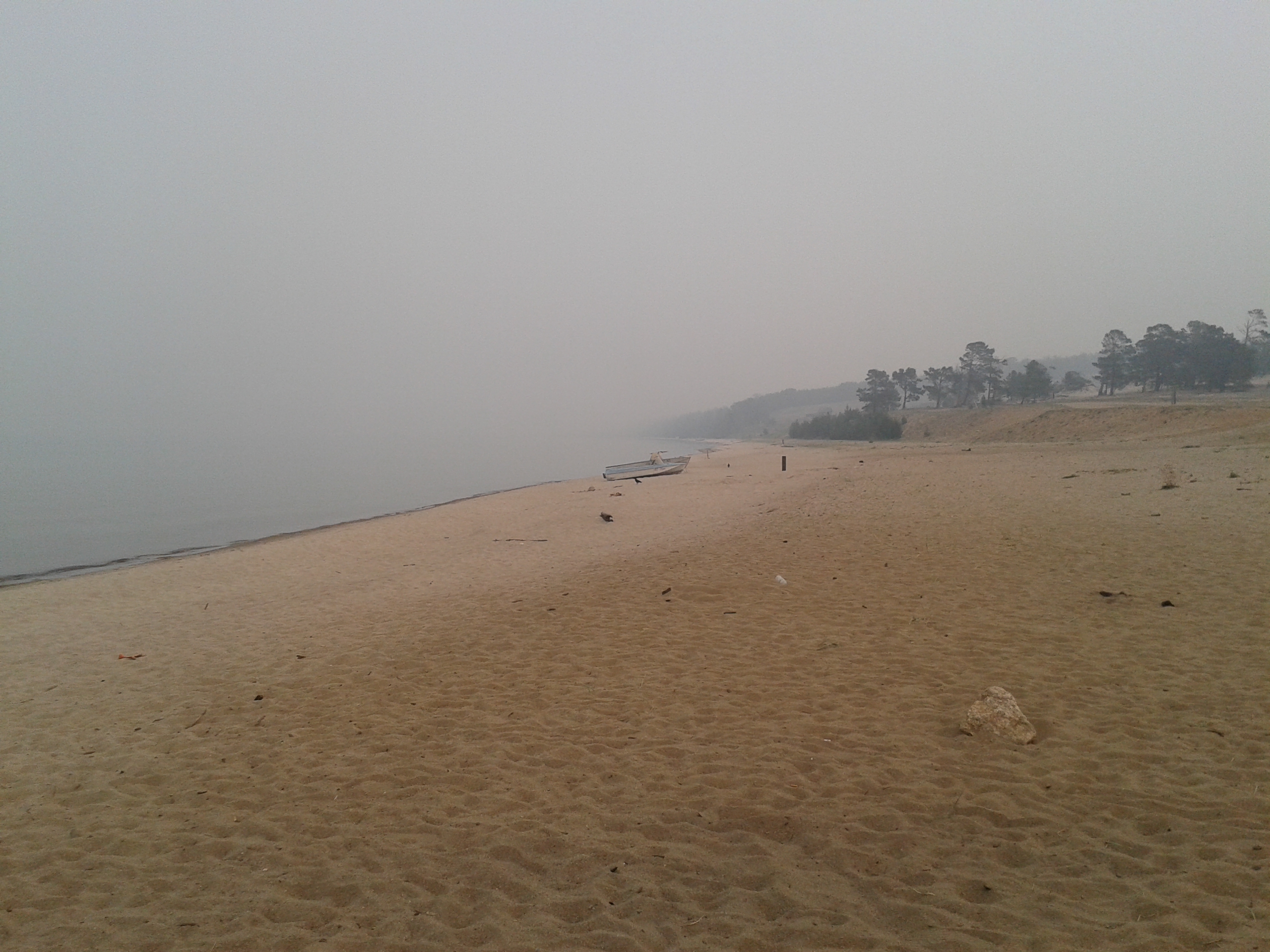 Auf dem Rückweg nach Khuzhir fuhr unser Bus den westlichen Teil der Küste ab und wir passierten zwei große Berge, deren Umrisse wir durch den Rauch nur erahnen konnten. Hier war das Land viel grüner und grasiger. Eine Pferdeherde stand unweit des steinigen Seeufers auf einer Weide. Ein kleines Fischerboot lag 100 Meter vom Ufer entfernt vor Anker. Es war schon ziemlich malerisch hier.