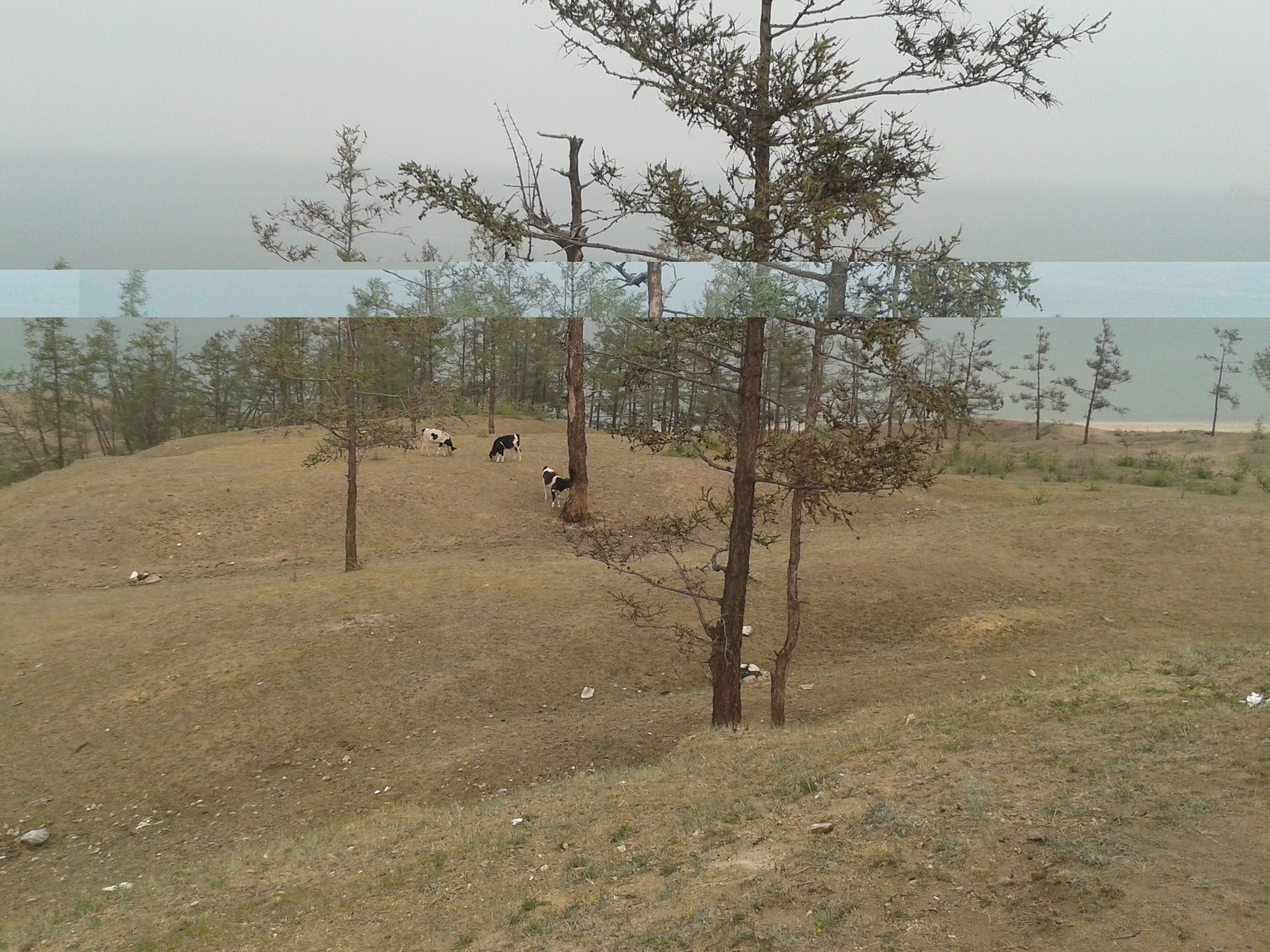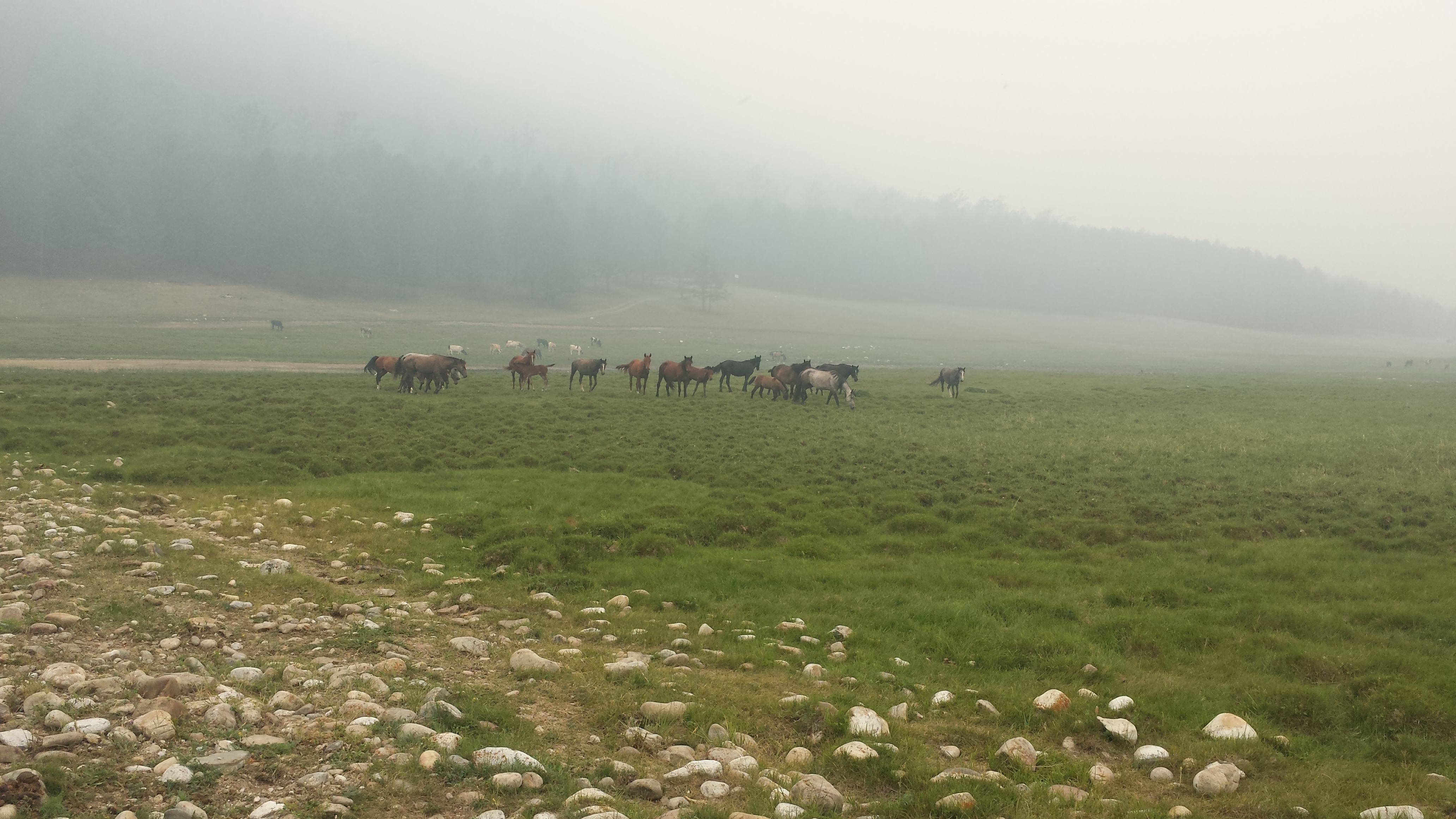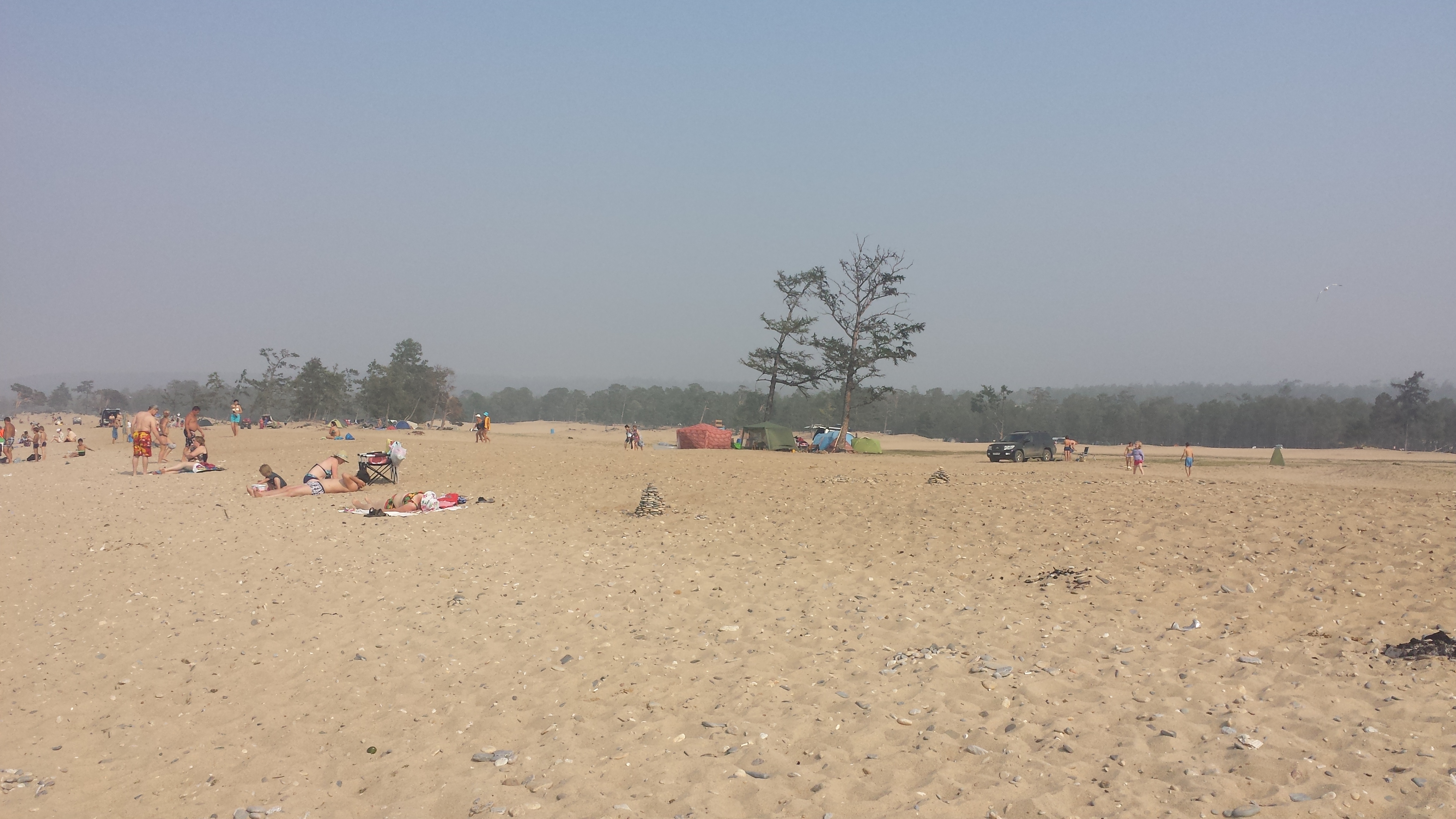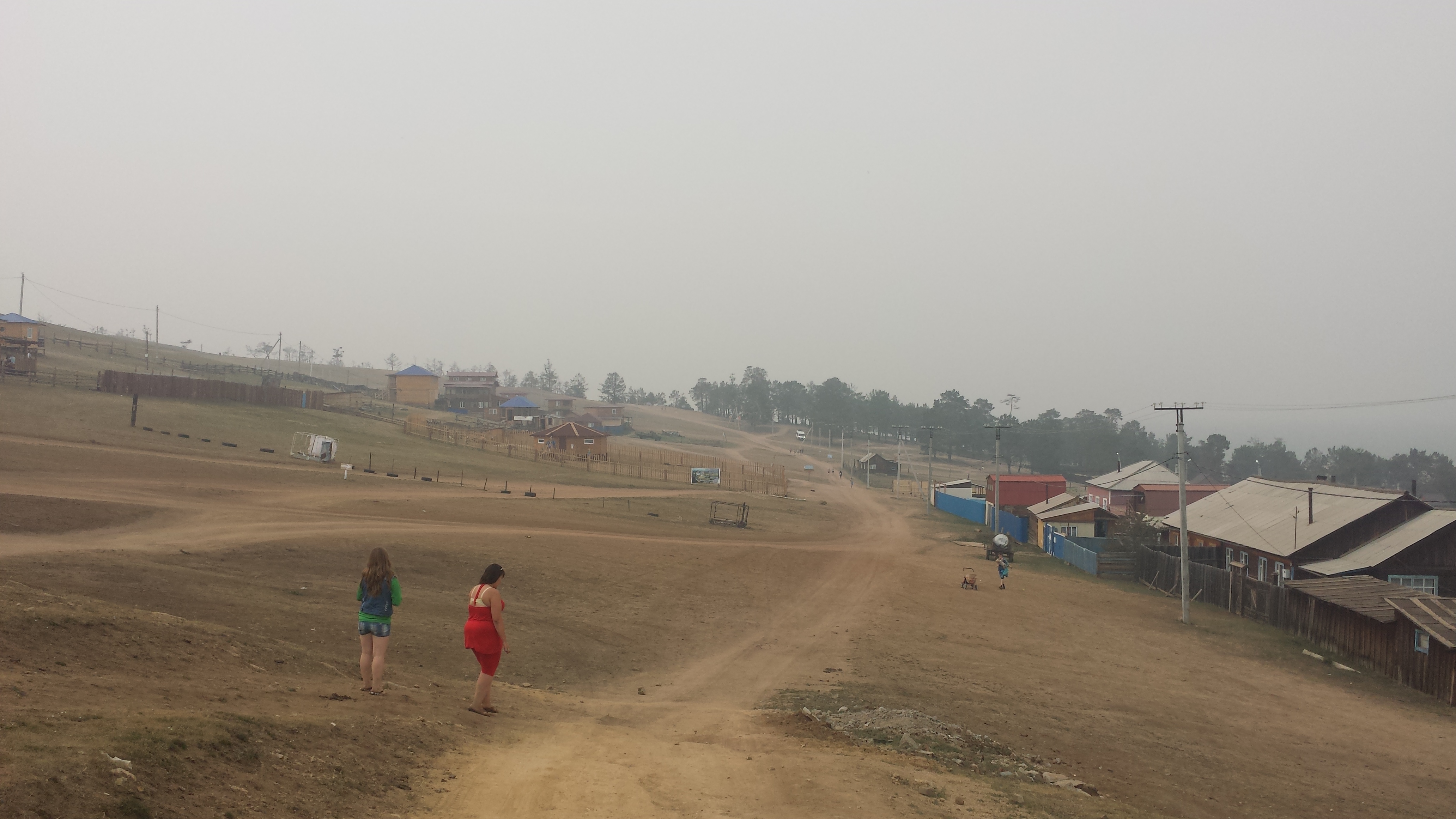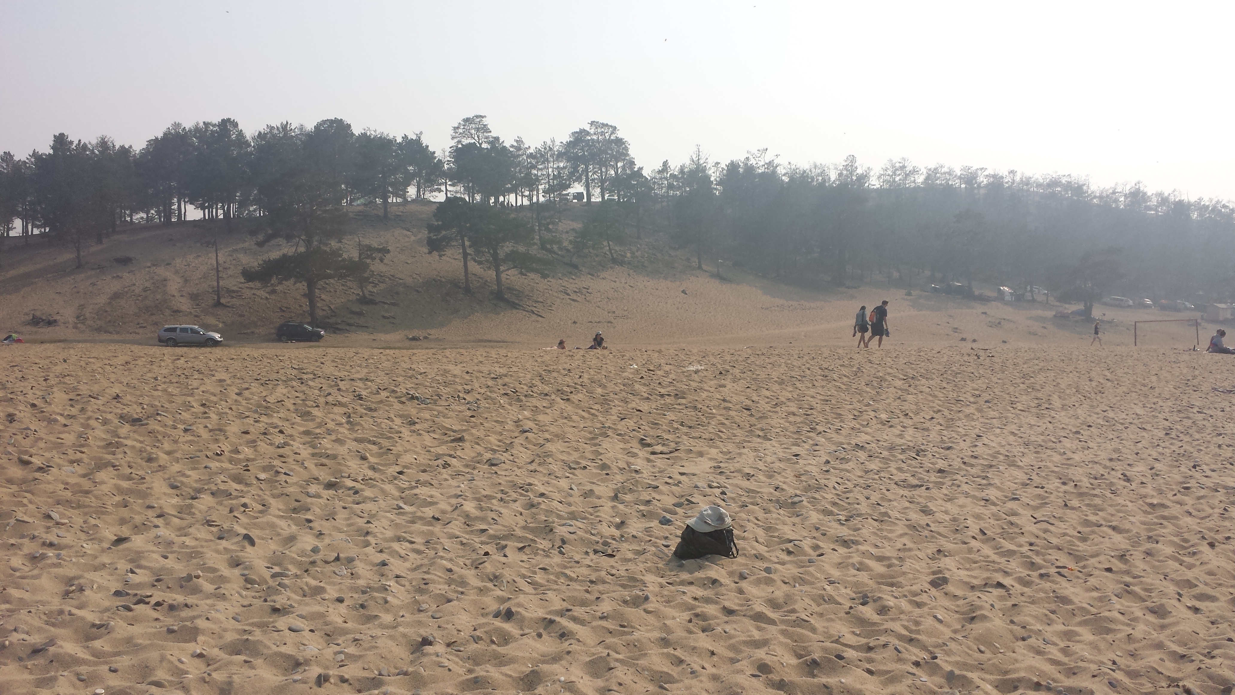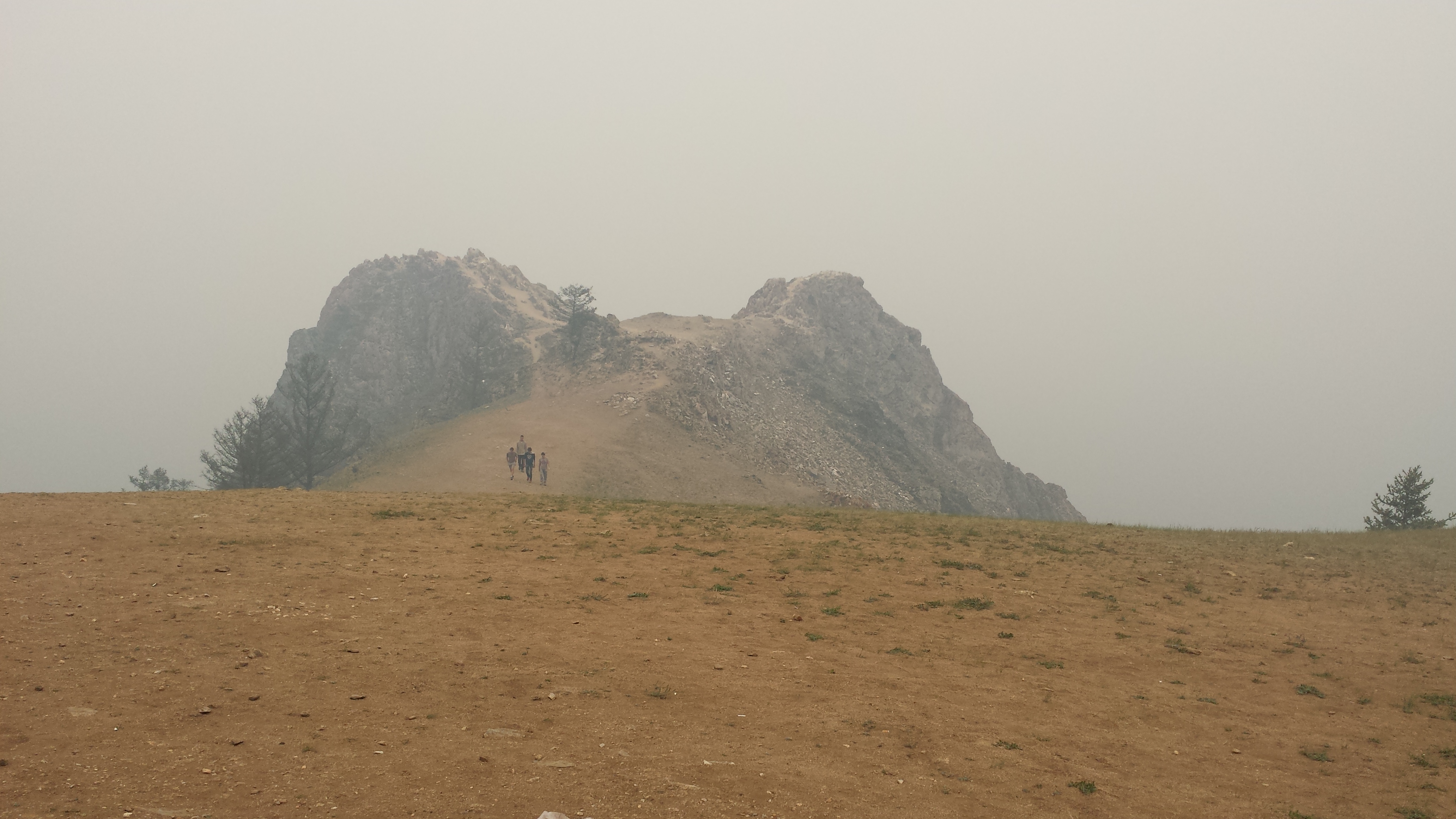Auf dem Rückweg nach Khuzhir fuhr unser Bus den westlichen Teil der Küste ab und wir passierten zwei große Berge, deren Umrisse wir durch den Rauch nur erahnen konnten. Hier war das Land viel grüner und grasiger. Eine Pferdeherde stand unweit des steinigen Seeufers auf einer Weide. Ein kleines Fischerboot lag 100 Meter vom Ufer entfernt vor Anker. Es war schon ziemlich malerisch hier.