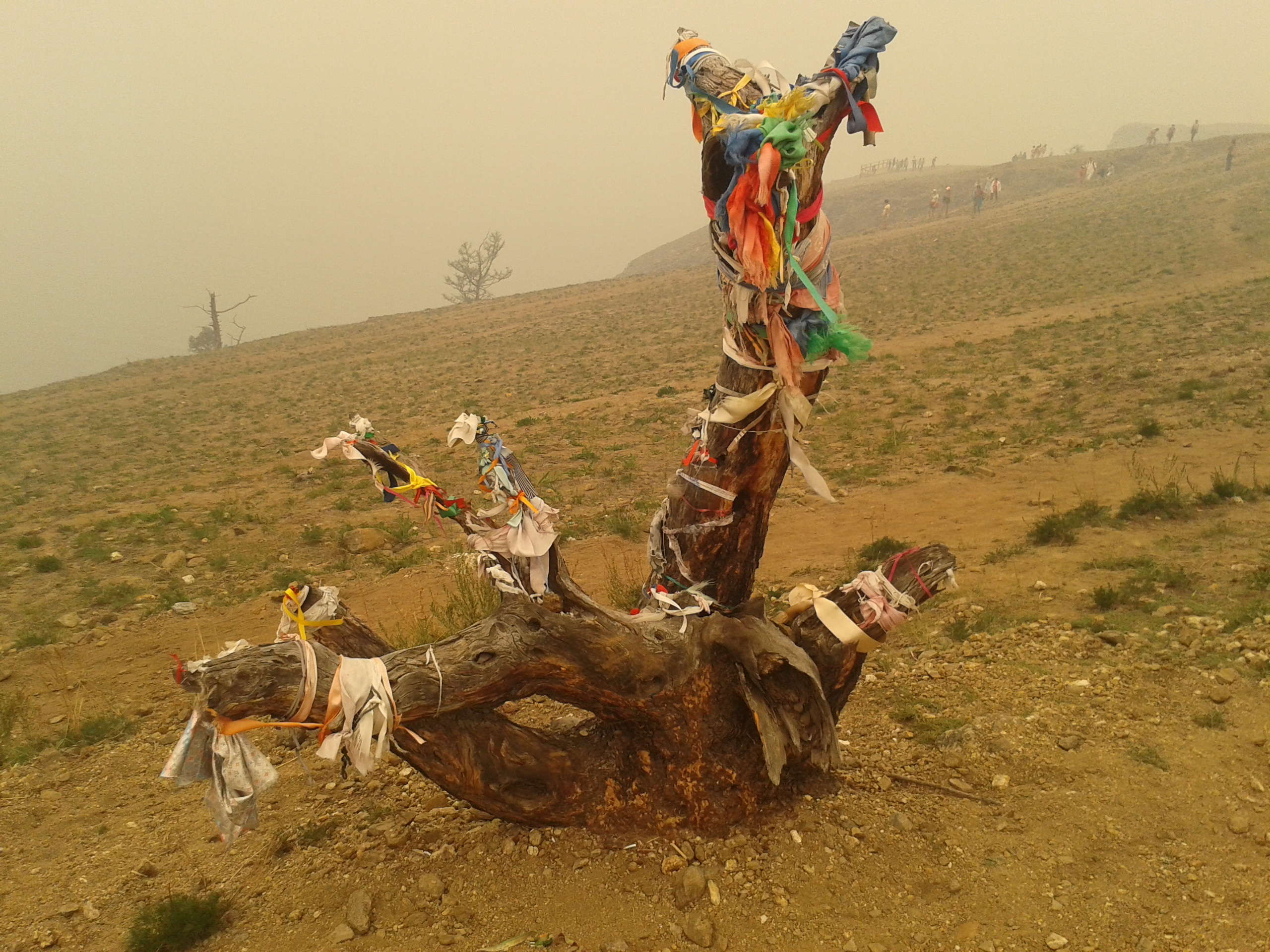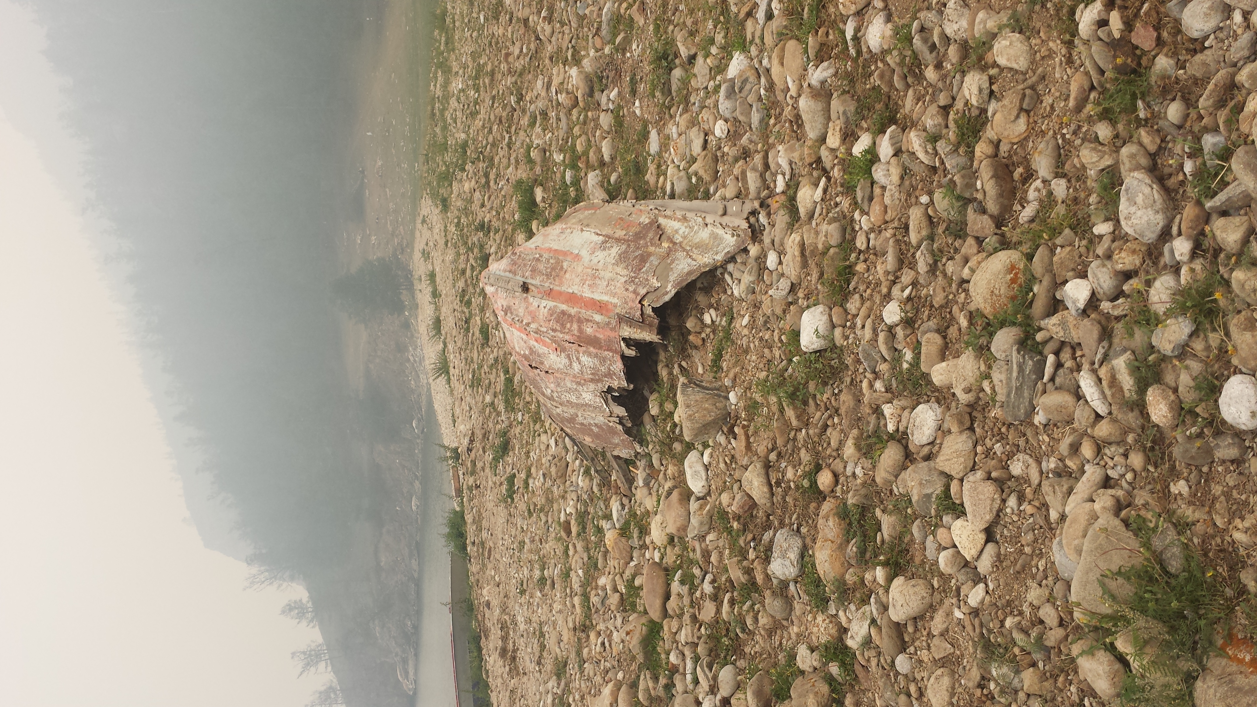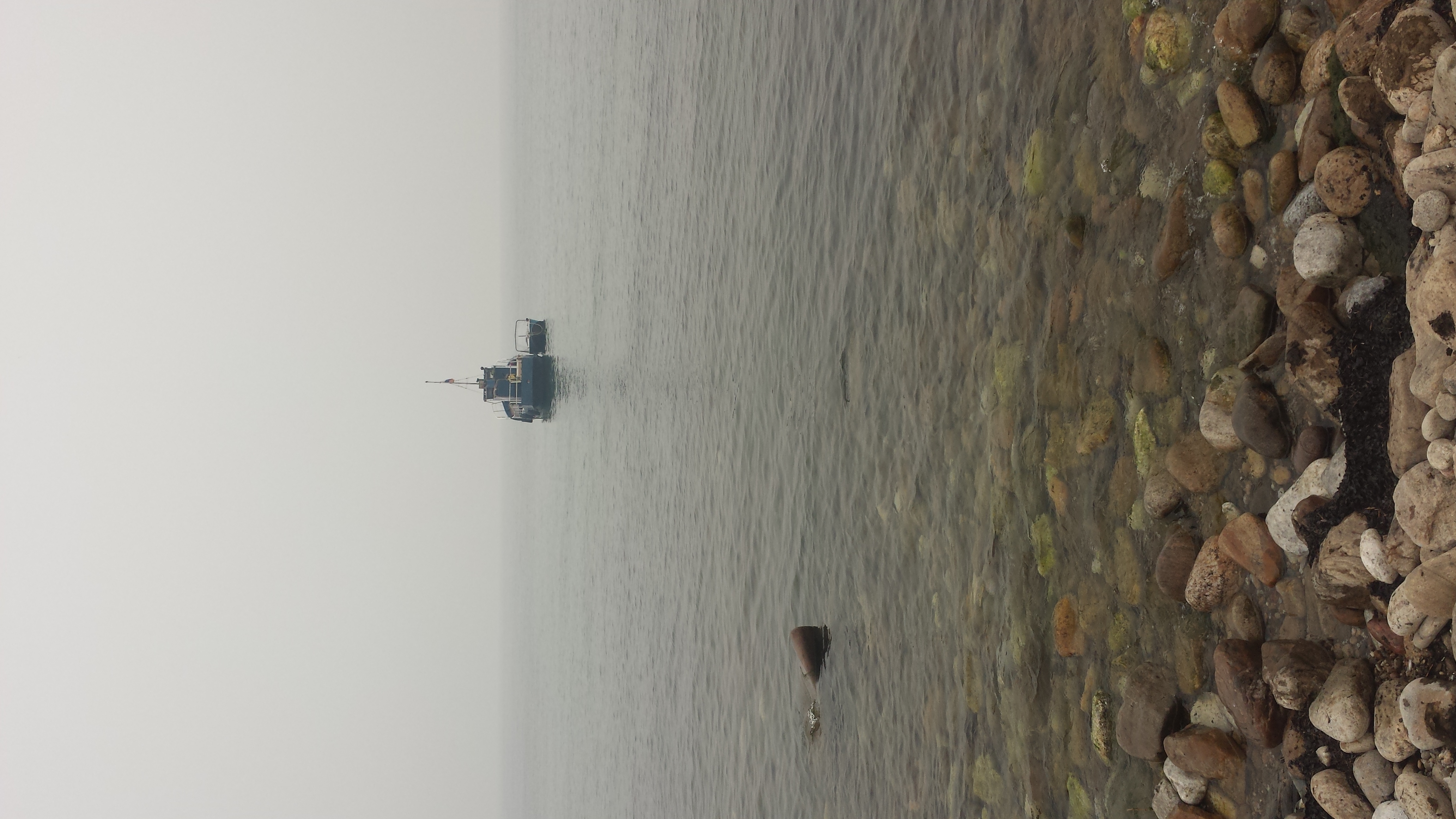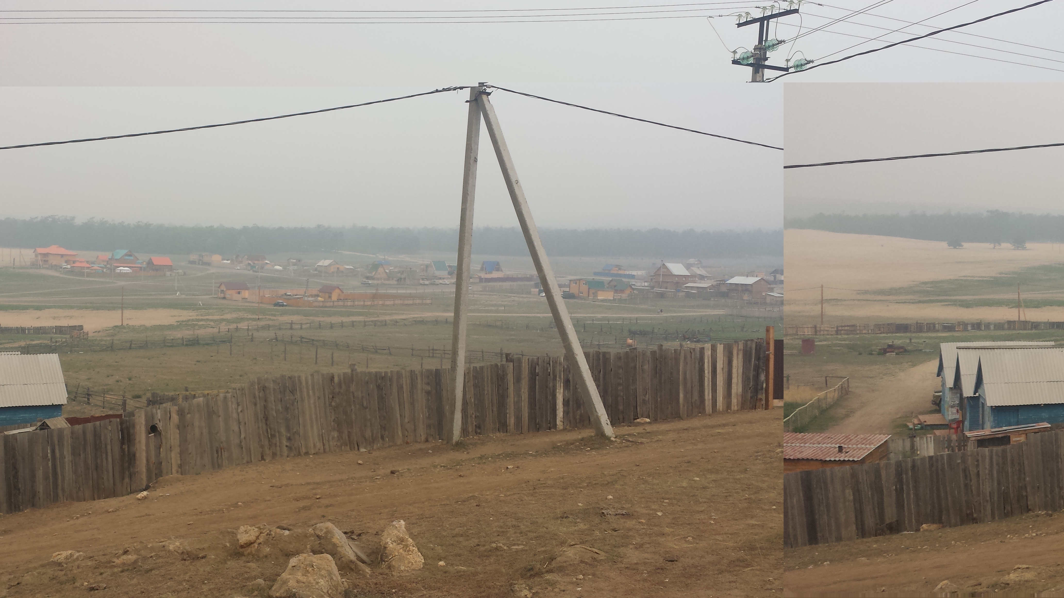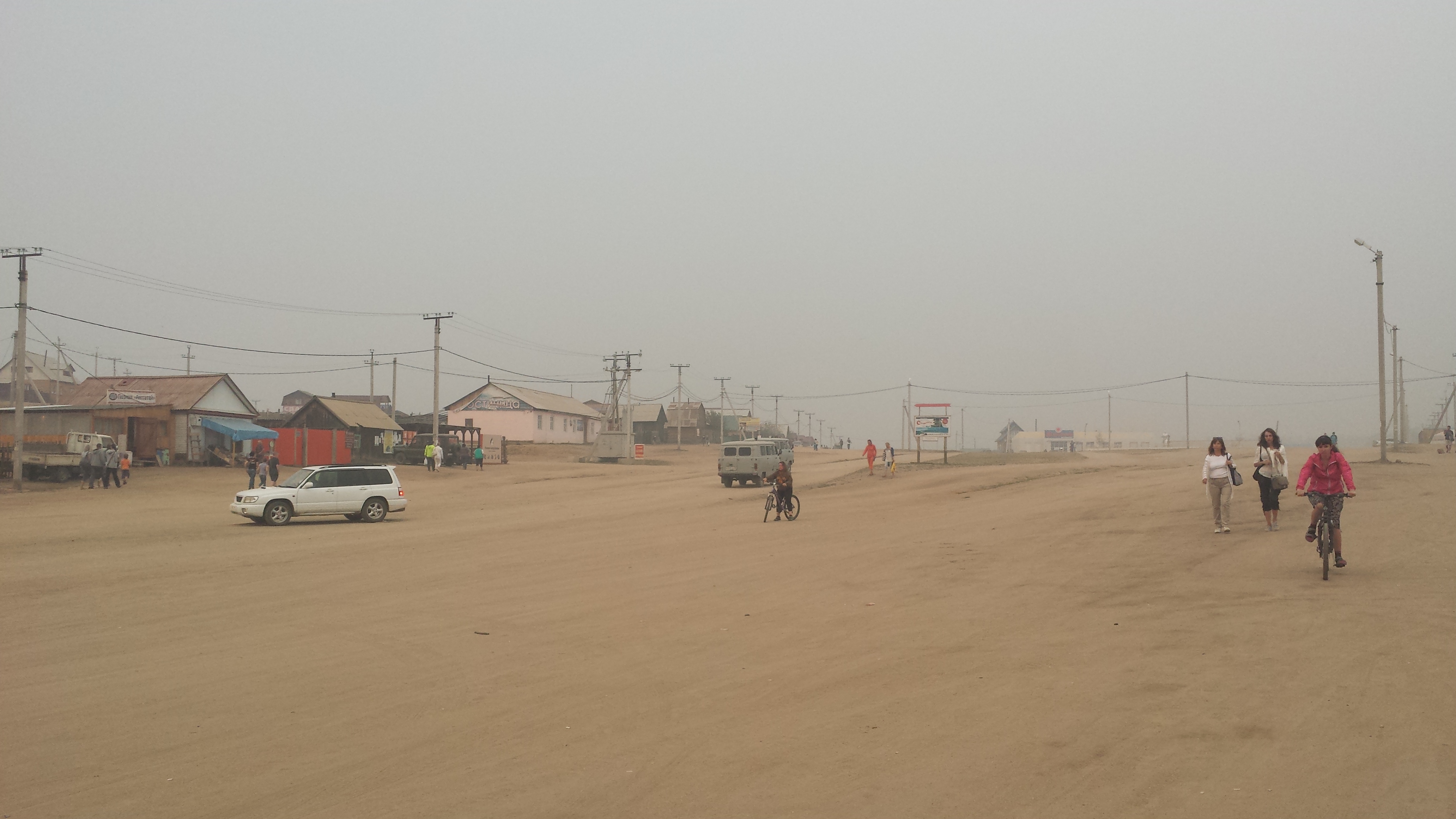 Auf dem Rückweg nach Khuzhir fuhr unser Bus den westlichen Teil der Küste ab und wir passierten zwei große Berge, deren Umrisse wir durch den Rauch nur erahnen konnten. Hier war das Land viel grüner und grasiger. Eine Pferdeherde stand unweit des steinigen Seeufers auf einer Weide. Ein kleines Fischerboot lag 100 Meter vom Ufer entfernt vor Anker. Es war schon ziemlich malerisch hier.