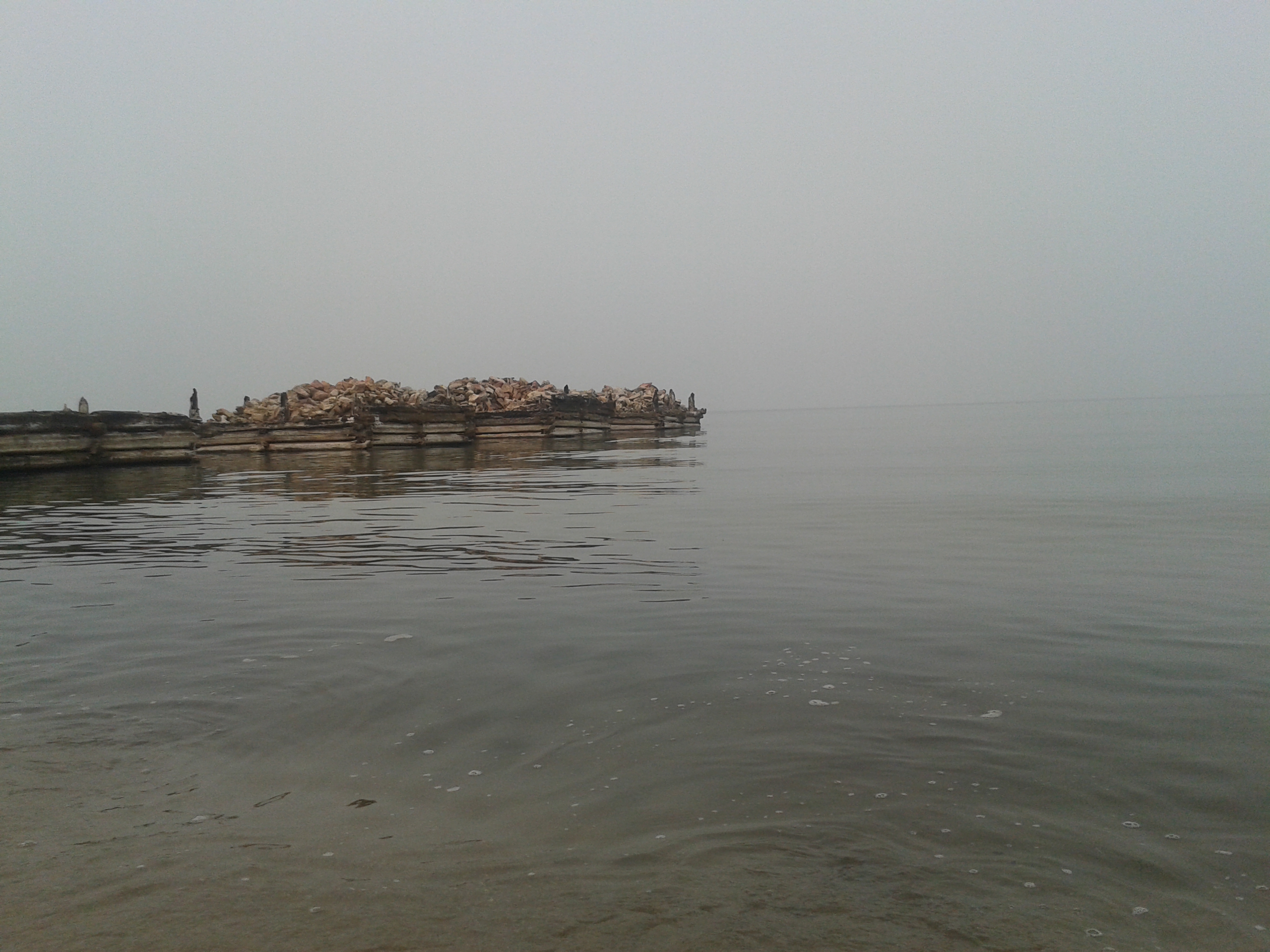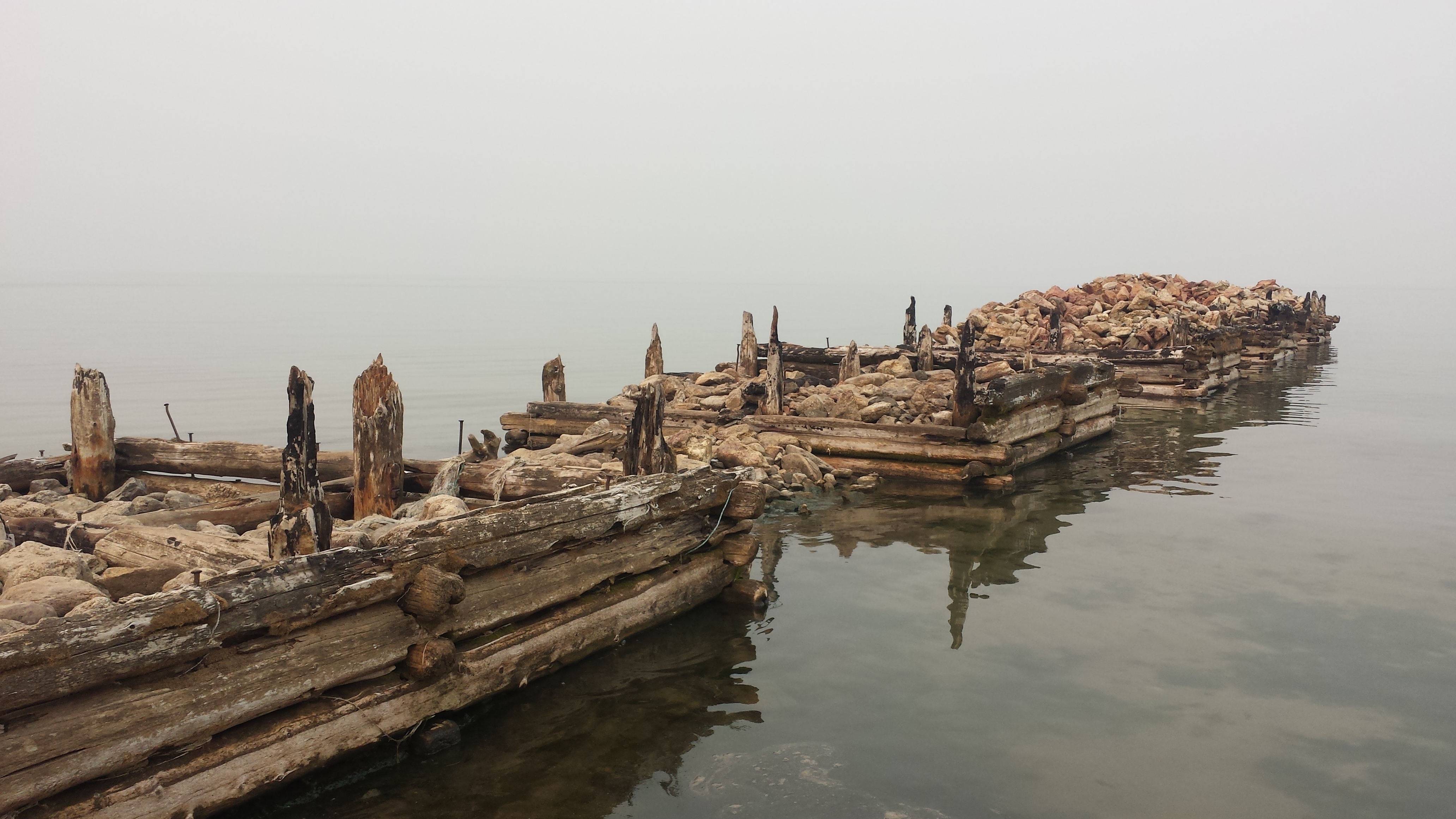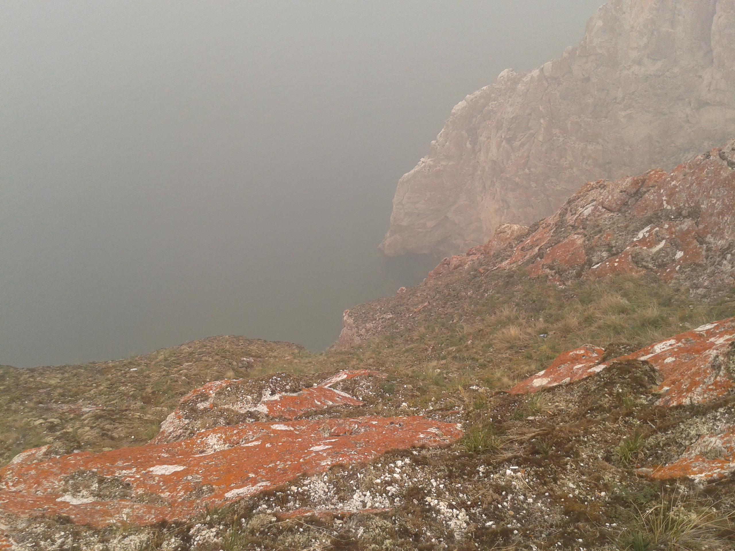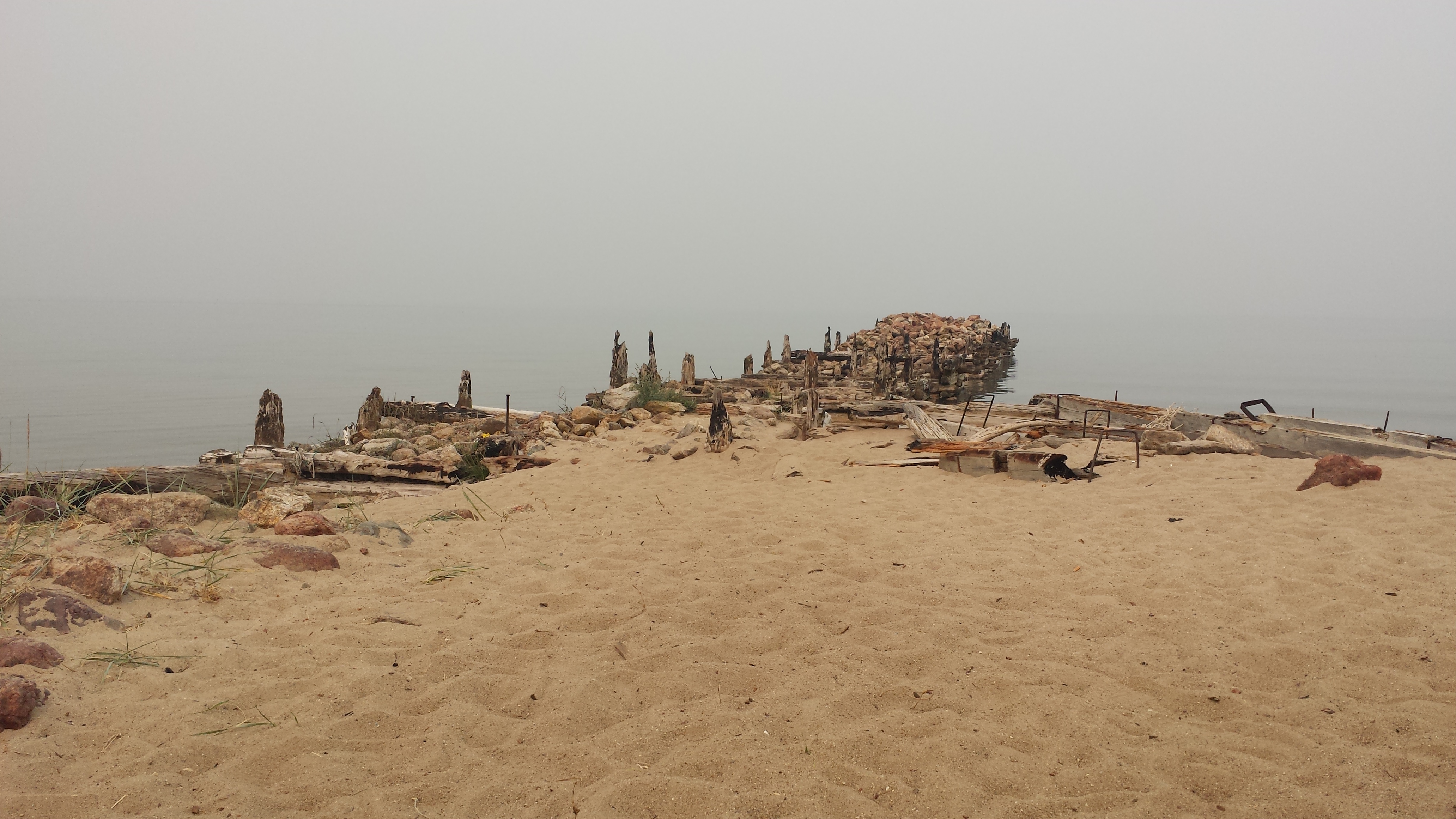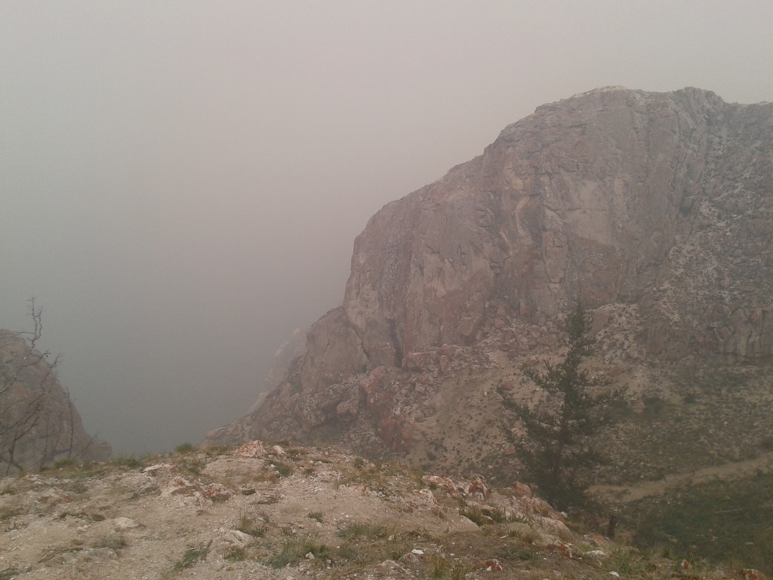 Auf dem Rückweg nach Khuzhir fuhr unser Bus den westlichen Teil der Küste ab und wir passierten zwei große Berge, deren Umrisse wir durch den Rauch nur erahnen konnten. Hier war das Land viel grüner und grasiger. Eine Pferdeherde stand unweit des steinigen Seeufers auf einer Weide. Ein kleines Fischerboot lag 100 Meter vom Ufer entfernt vor Anker. Es war schon ziemlich malerisch hier.