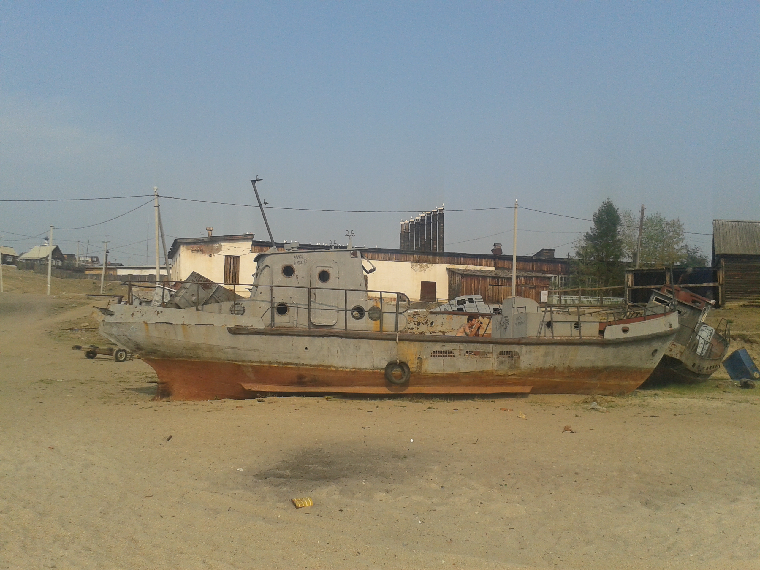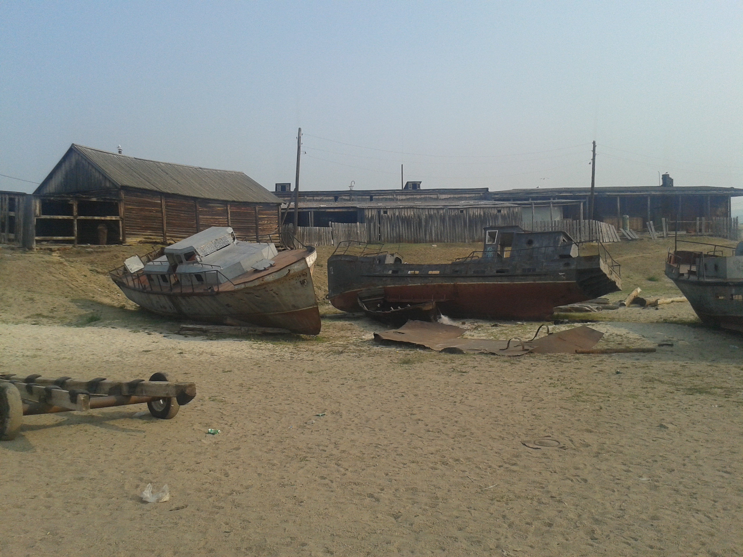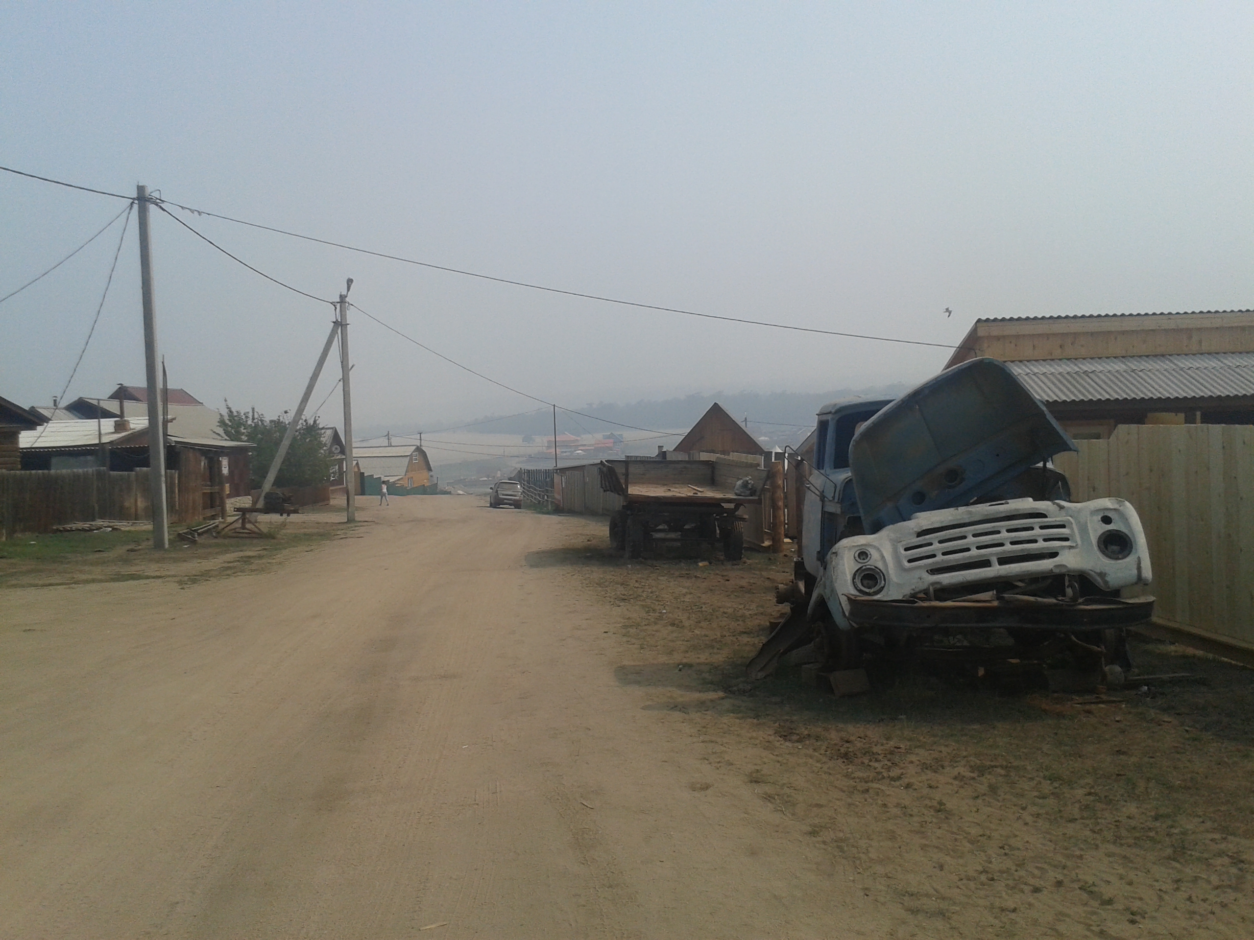 Weiter ging es dann durch leicht bewaldetes Gebiet zu einem weiteren Dorf, aber sehr viel kleiner als Khuzhir. Hier lebten nur noch 1500 Menschen und das ganze Jahr über nur drei Familien. Früher war das aber mal das größte Dorf der Insel und ein Gefängnis für Verbannte aus der Zeit Stalins. Man erkannte noch die Reste eines Bootsanlegers und einer Rampe, die vom Wasser weg hinein in den Ort führte. Am Ende der Straße ortsauswärts gab es ein hölzernes Kreuz für die dort im Gefängnis gestorben Menschen.