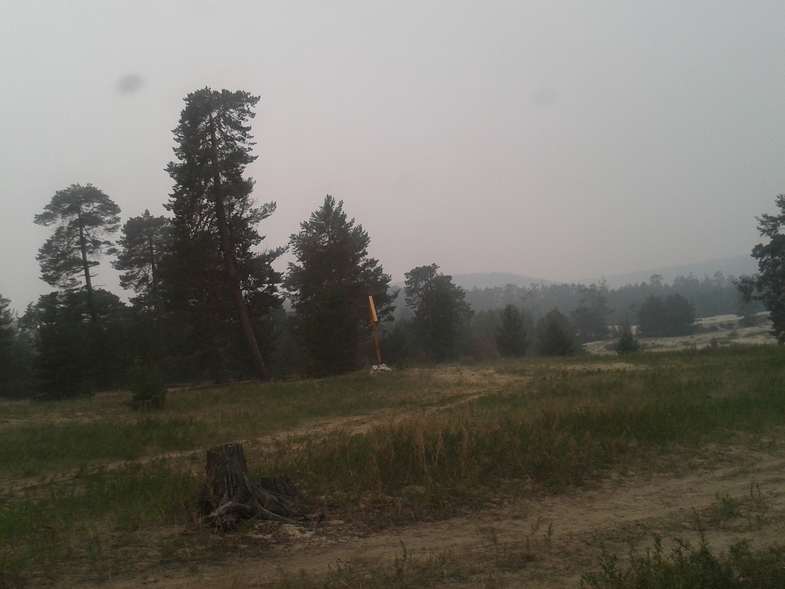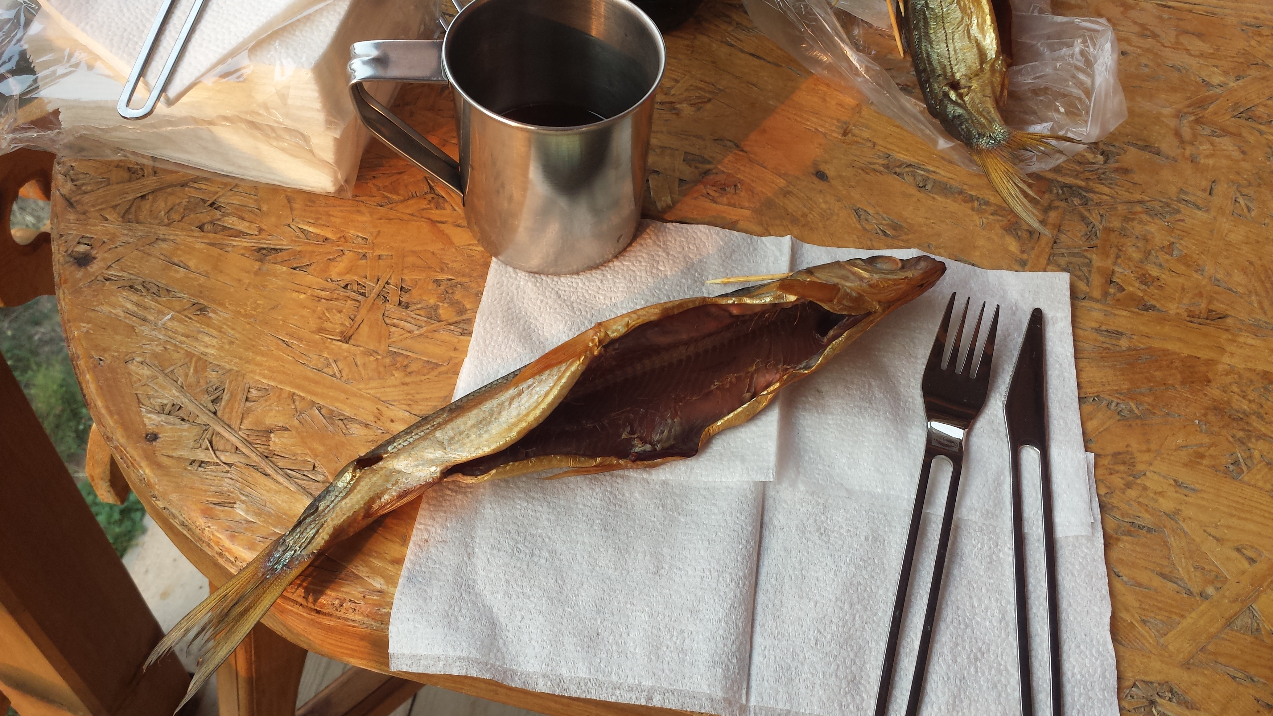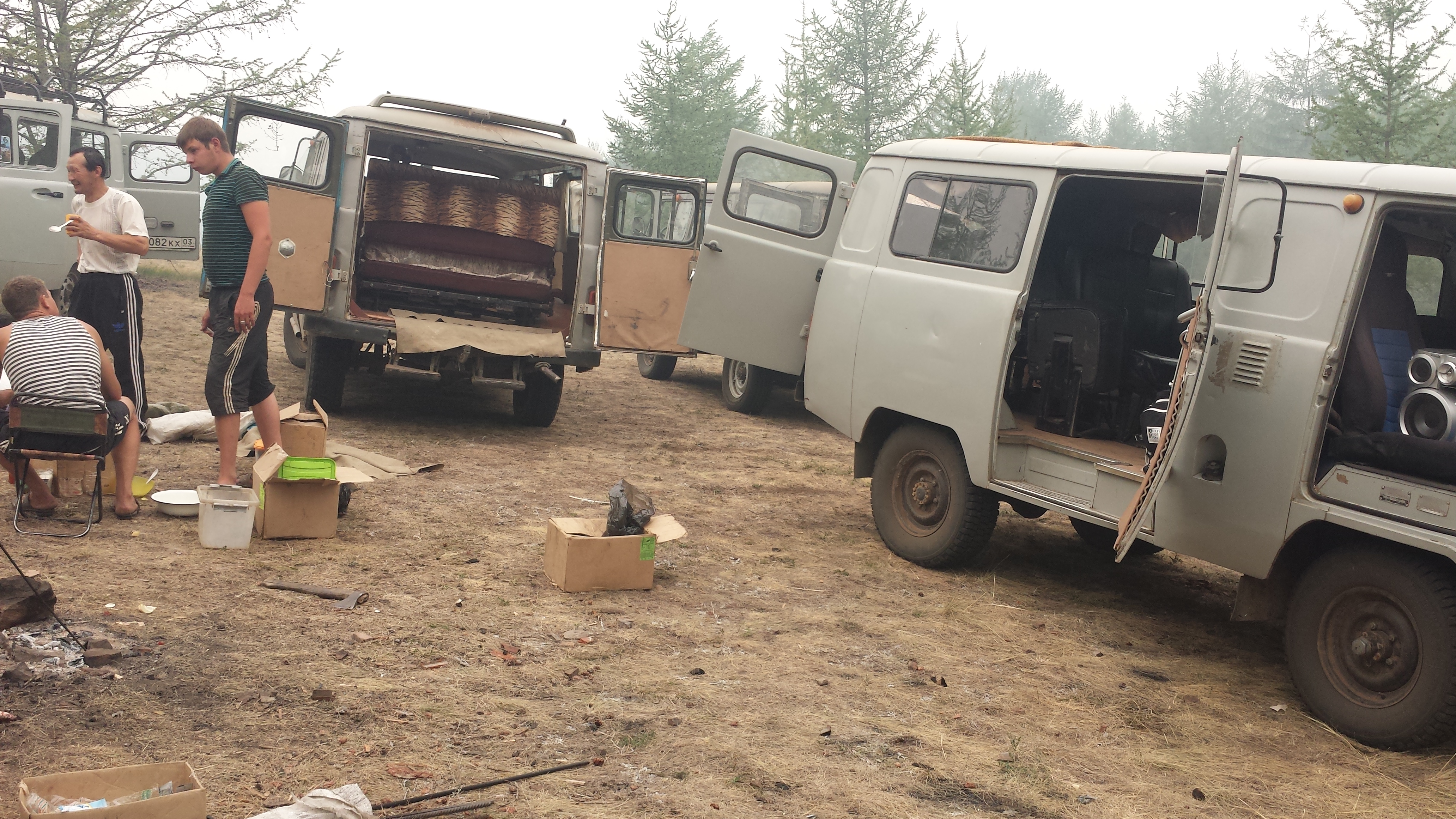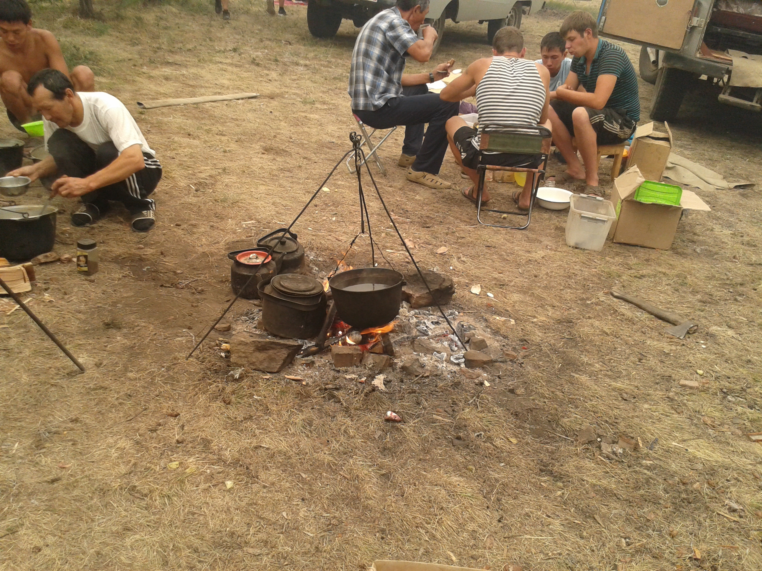 Auf dem Rückweg zum Bus loggte ich nach kurzer Suche noch den hier vorhandenen Geocache, sichtgeschützt durch die Luft. Am Parkplatz angekommen, besser gesagt, an den Parkplätzen der anderen Busse vorbeikommend wurde auch die Hauptursache von Waldbränden sehr schnell klar: Menschen. Menschen die ihr Feuer nach dem Fressen nicht löschen, verursachen Waldbrände. Erst recht, wenn der Boden und die Bäume durch ausbleibenden Regen wochenlang ausgedürrt sind und man die Feuerstellen nach Gebrauch nicht gescheit löscht. Nunja, bei uns gab es aber nun erstmal Salat und aufgewärmte Fischsuppe. Ehrlich gesagt, war das sogar eine ziemlich leckere Fischsuppe, die die Buslenker da am Lagerfeuer herbeigezaubert hatten. Viel blieb da jedenfalls nicht übrig. Auch das Feuer wurde nach der Tee- und Keksrunde dann anschließend halbwegs gelöscht.
