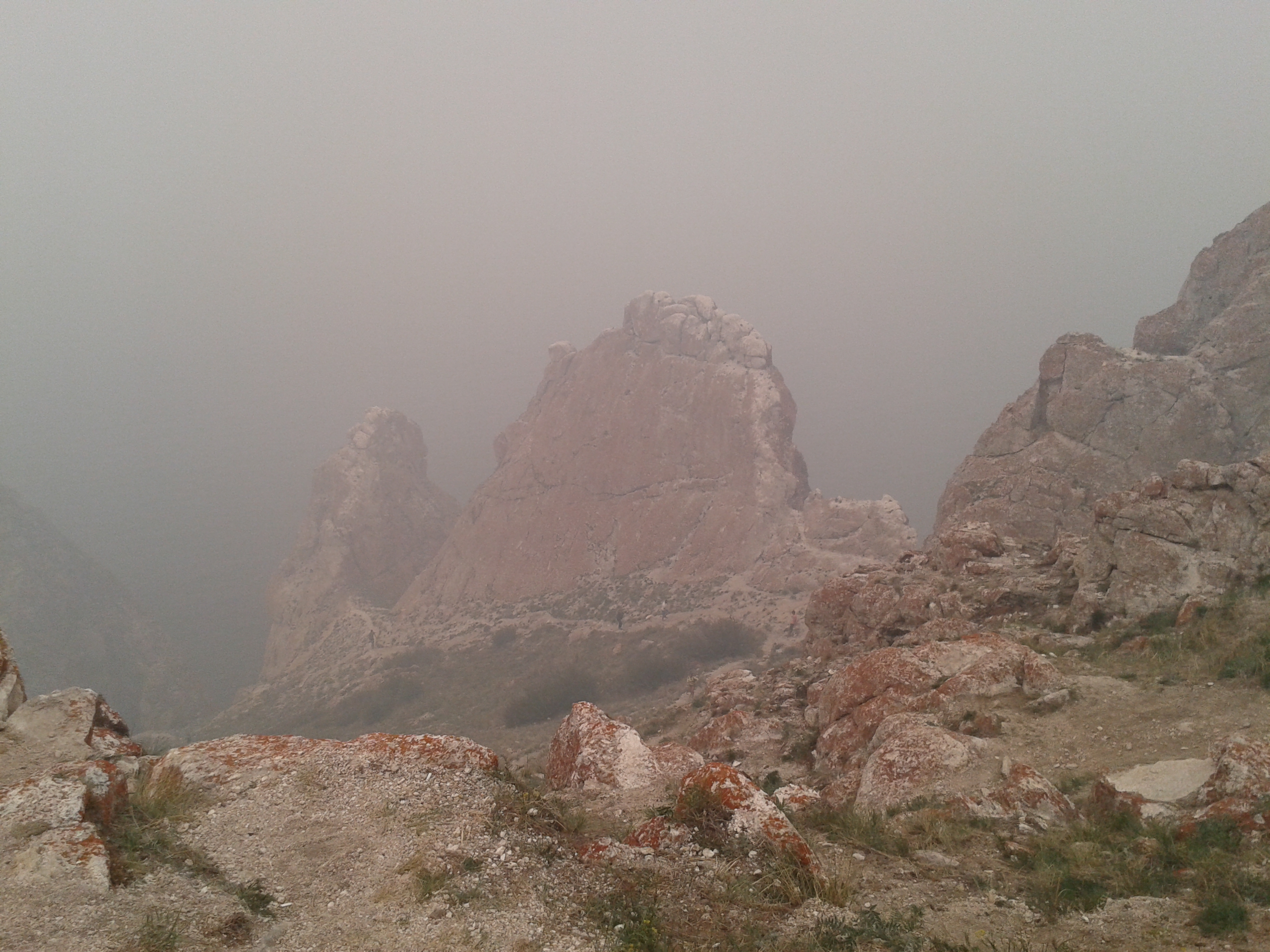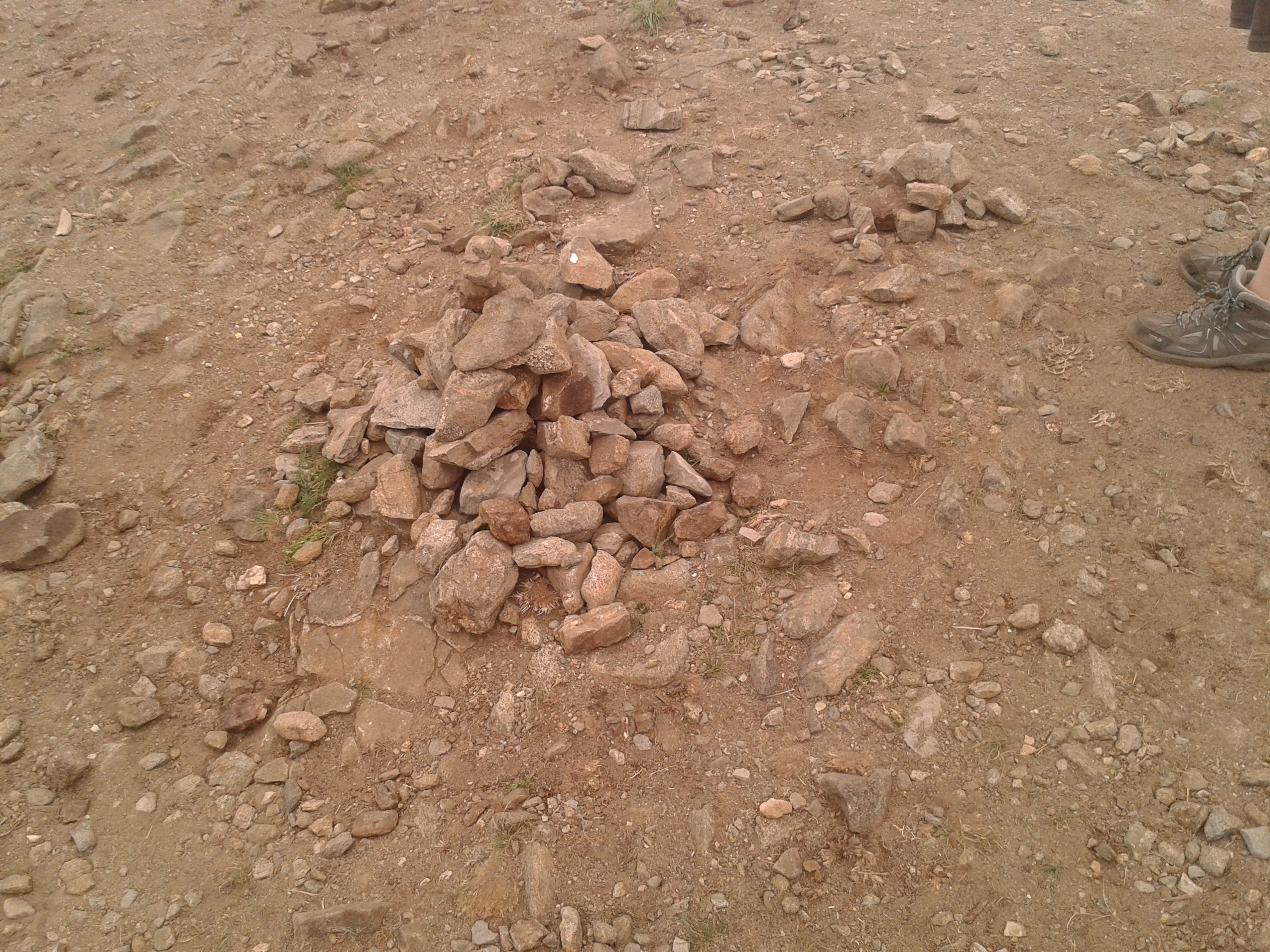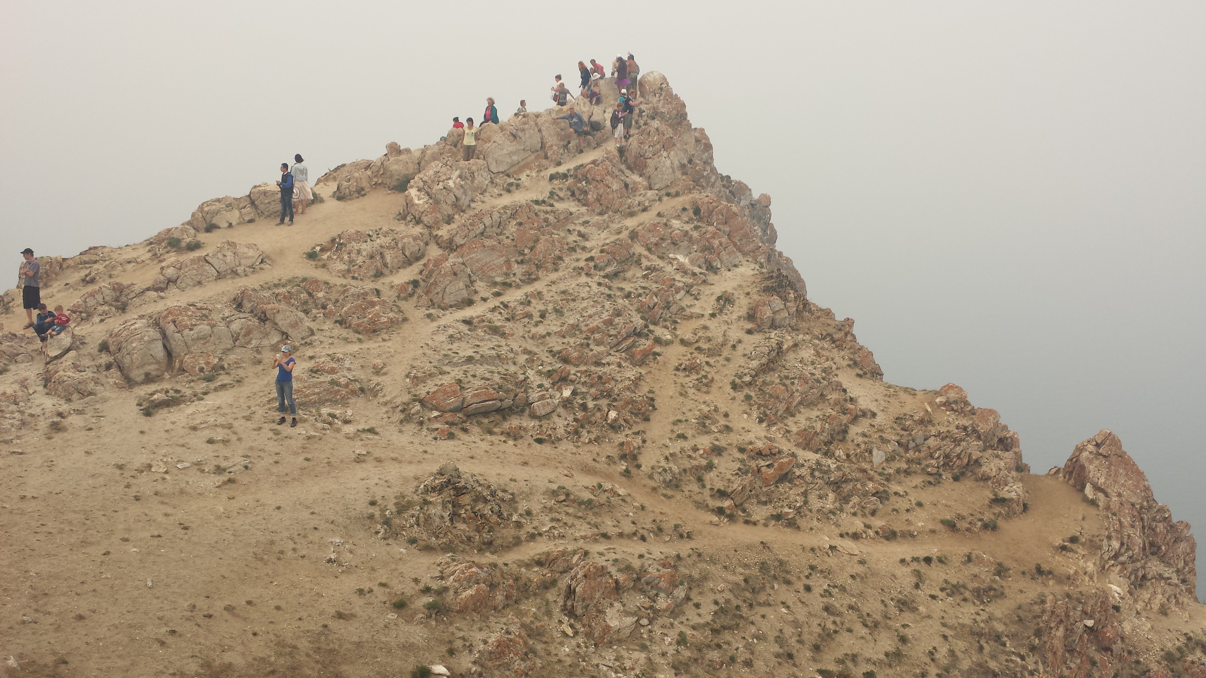Die restlichen 600 Meter zur Spitze waren auch relativ leicht gemacht. Der Weg war sehr karg, es ging teilweise über kleinere Steine und geröllartigen Boden. Zur besseren Aussicht hatte die örtliche Verwaltung hier in regelmäßigen Abständen hölzerne Platformen mit Geländer aufbauen lassen, damit man beim Fotoknipsen nicht in die Tiefe fällt. Leider war heute die Aussicht aufgrund der Aschewolke extrem unspektakulär und so drehten wir unsere Runde auf dem Weg und bauten neben vielen anderen eins, zwei Steinmännchen.