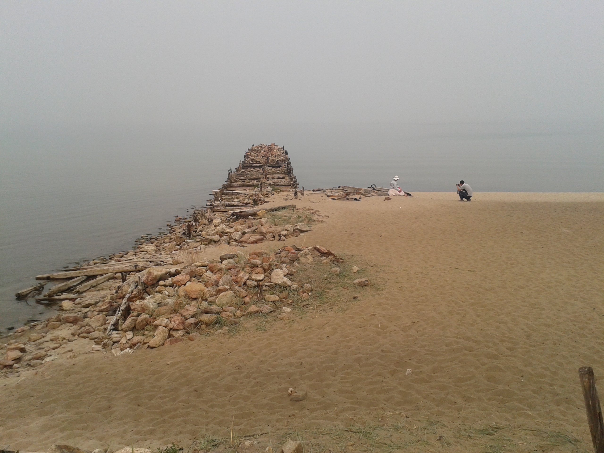Zunächst ging die Fahrt gewohnt über die Straße, eigentlich ein angehäufter aber nicht befestigter Damm. Ziemlich staubig wars, wenn man nicht im ersten Gefährt daherbrauste. Beim Blick nach hinten machte auch Sinn, warum die mit eingeschaltetem Licht fuhren. Nach 5 Kilometern passierten wir den Flugplatz, der eigentlich nur aus zwei Flugzeugen, einer Rollpiste und einem Haus mit Windfähnchen bestand. Die weitere Fahrt über eine steppenähnliche und hüglige Landschaft ging noch eine ganze Weile weiter, bis wir an einem Punkt mit Aussicht auf zwei kleine Inseln und ein paar große Felsen Halt machen. Dort horchten wir den Erzählungen der Reiseleitung über einige der Sagen nachdem Menschen zu diesen Steinen geworden sind weil sie irgendwas nicht richtig gemacht hatten oder böse waren. So Sagen halt.