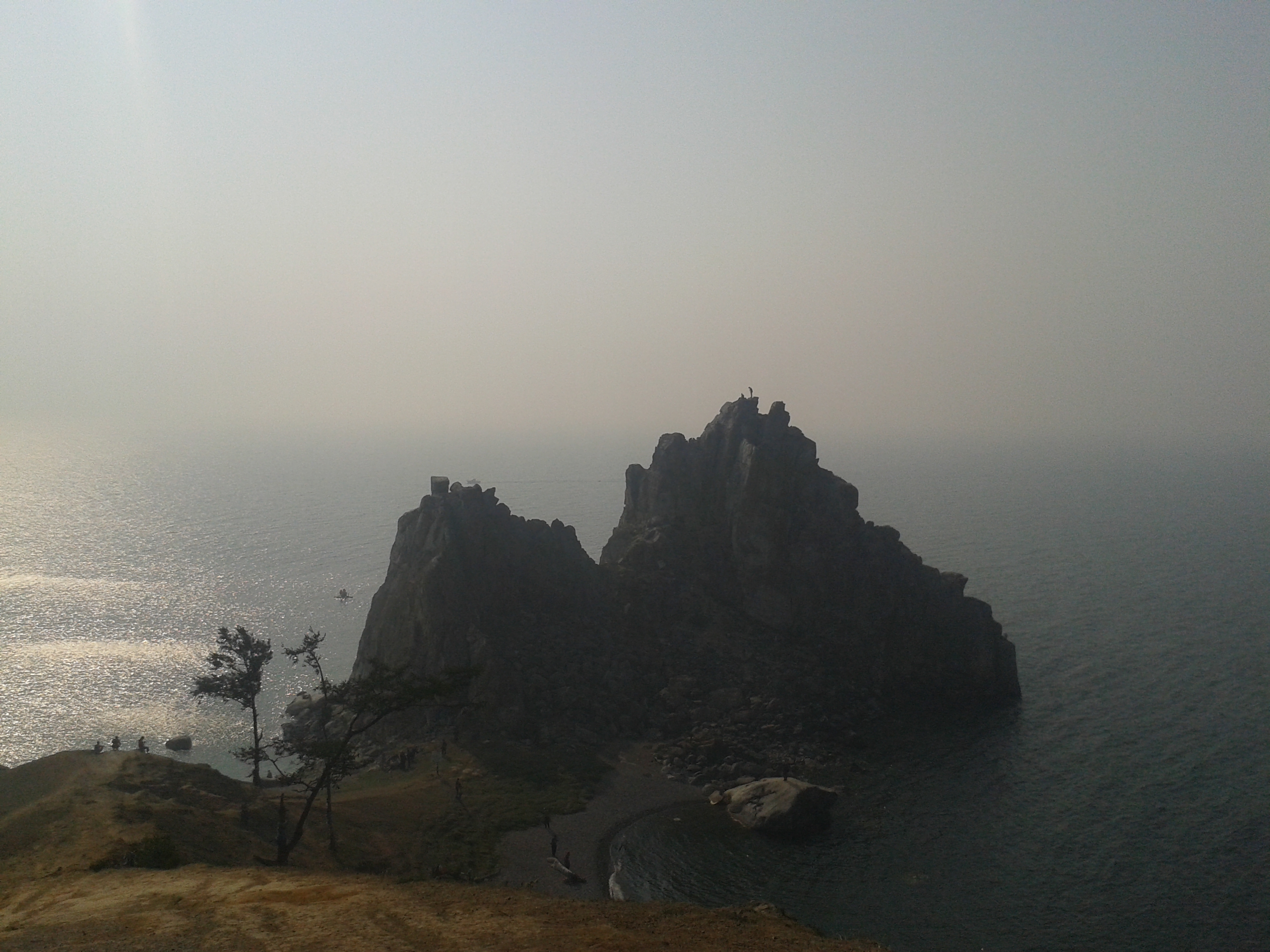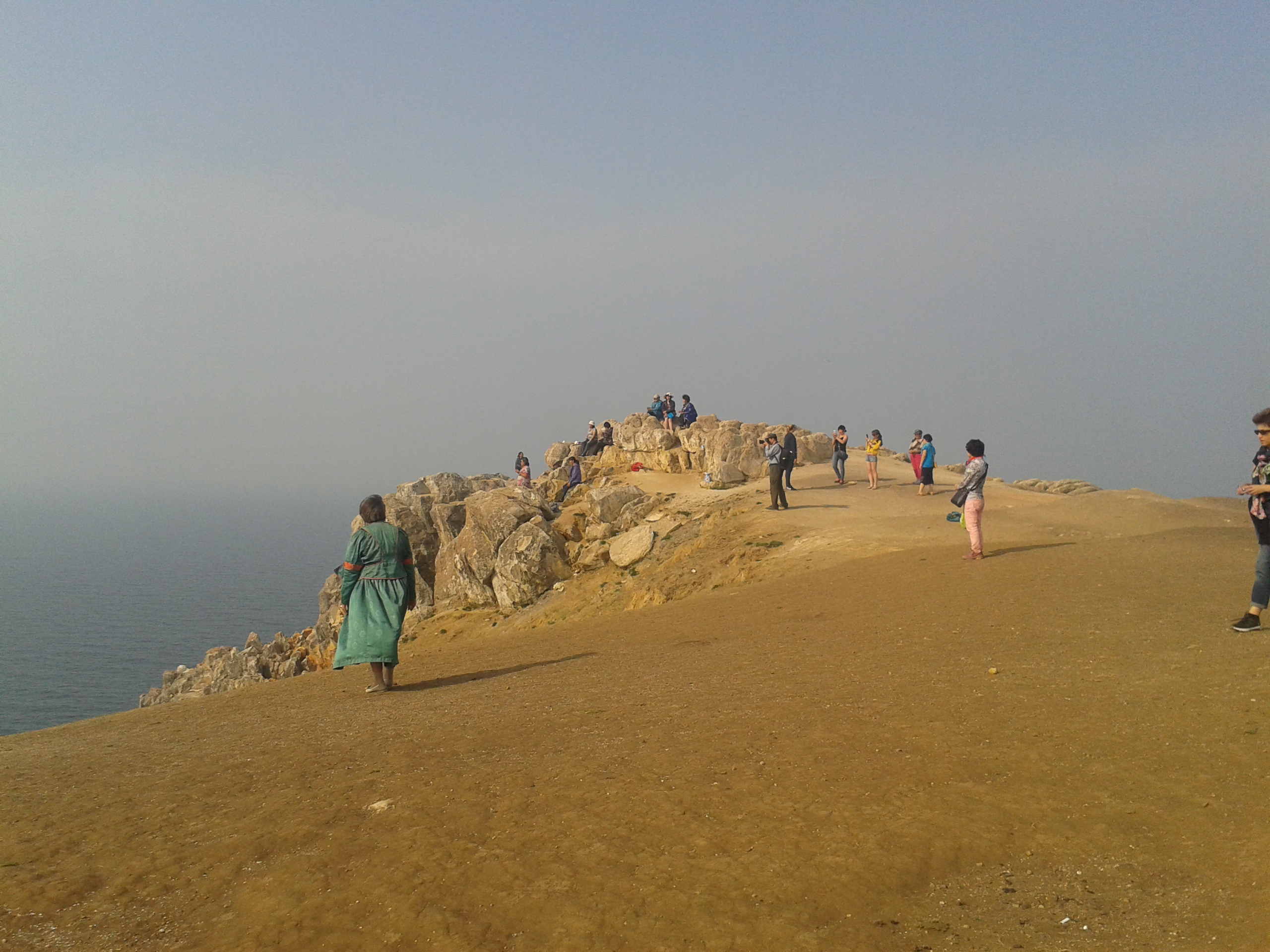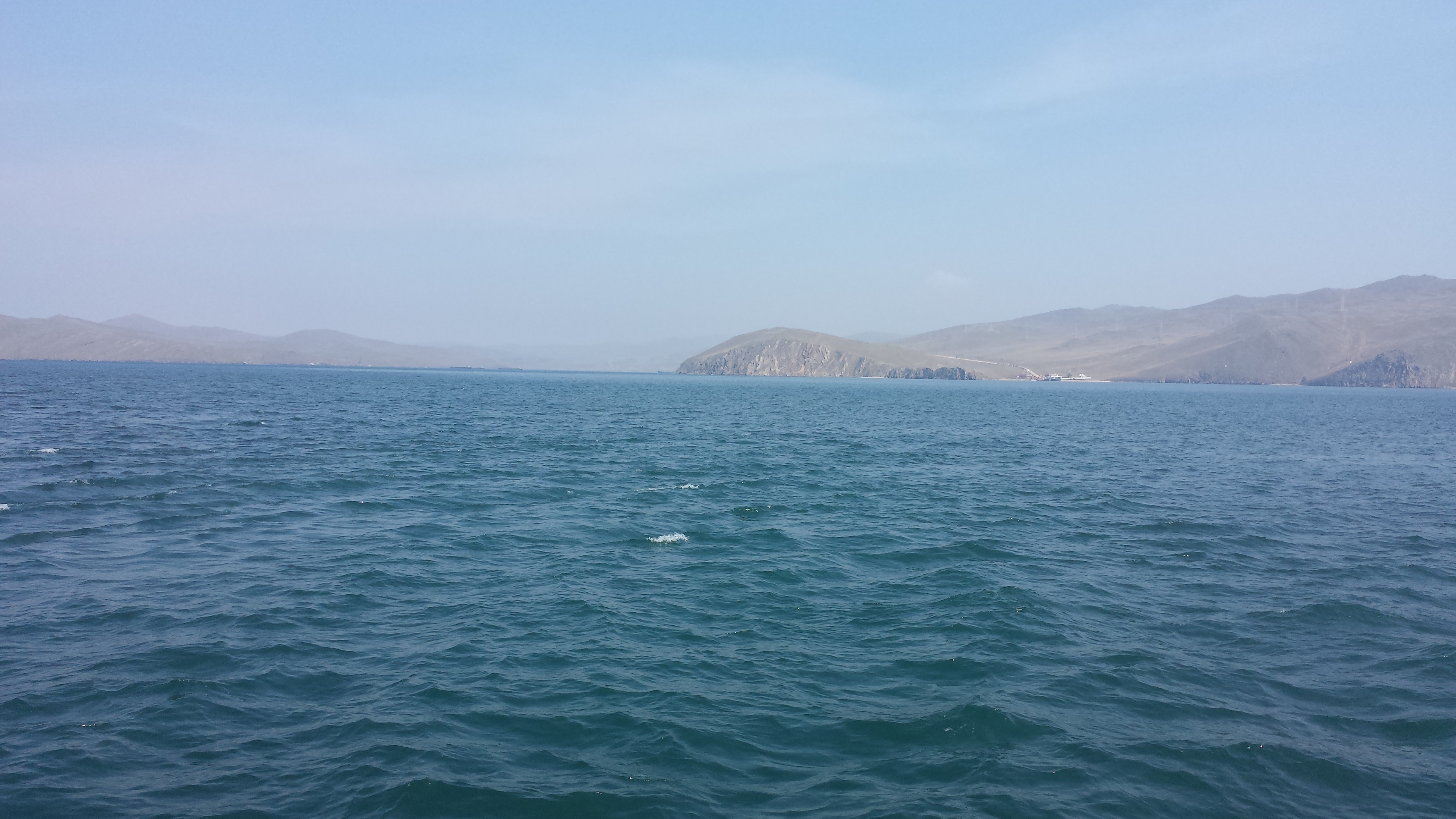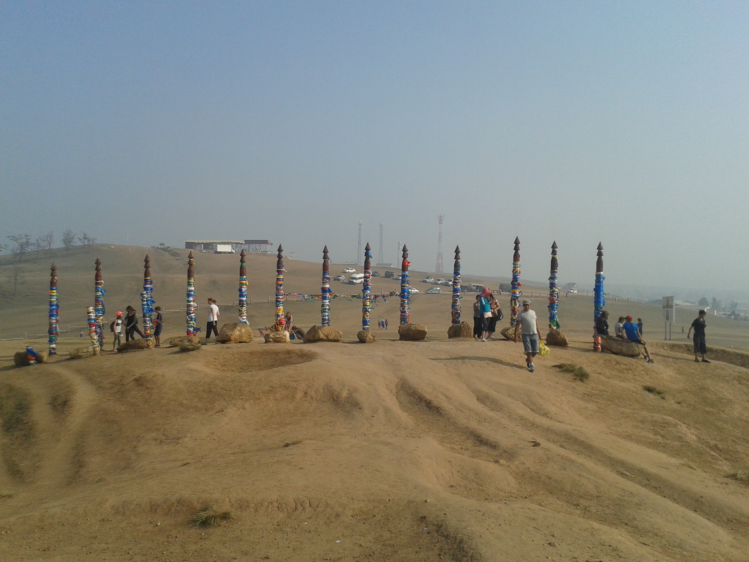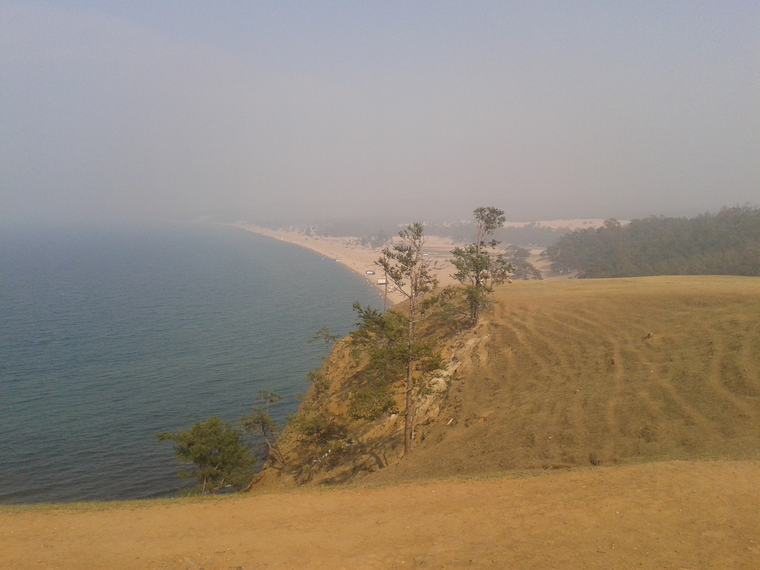 Die weitere Fahrt führte unseren Bus durch karges Gelände, bis 50km vor der Insel gab es noch asphaltierte Straßen, danach ging es weiter über Schotterpisten. Die Landschaft gleichte auch eher einer bergigen Wüste. Bäume gab es nur sehr wenige und diese, die an den Hängen standen, hätte man denken können, würden zerhackt und in Deutschland in großen Tüten als Grill-Holzkohle verkauft. Es lag eine Art Rauch in der Luft, leicht nach verbranntem Holz riechend aber nicht stark genug im ein Brand sein zu können. Mit großer Erleichterung wurden bald erste Ufer des Baikalsees hinter den Hügeln sichtbar.