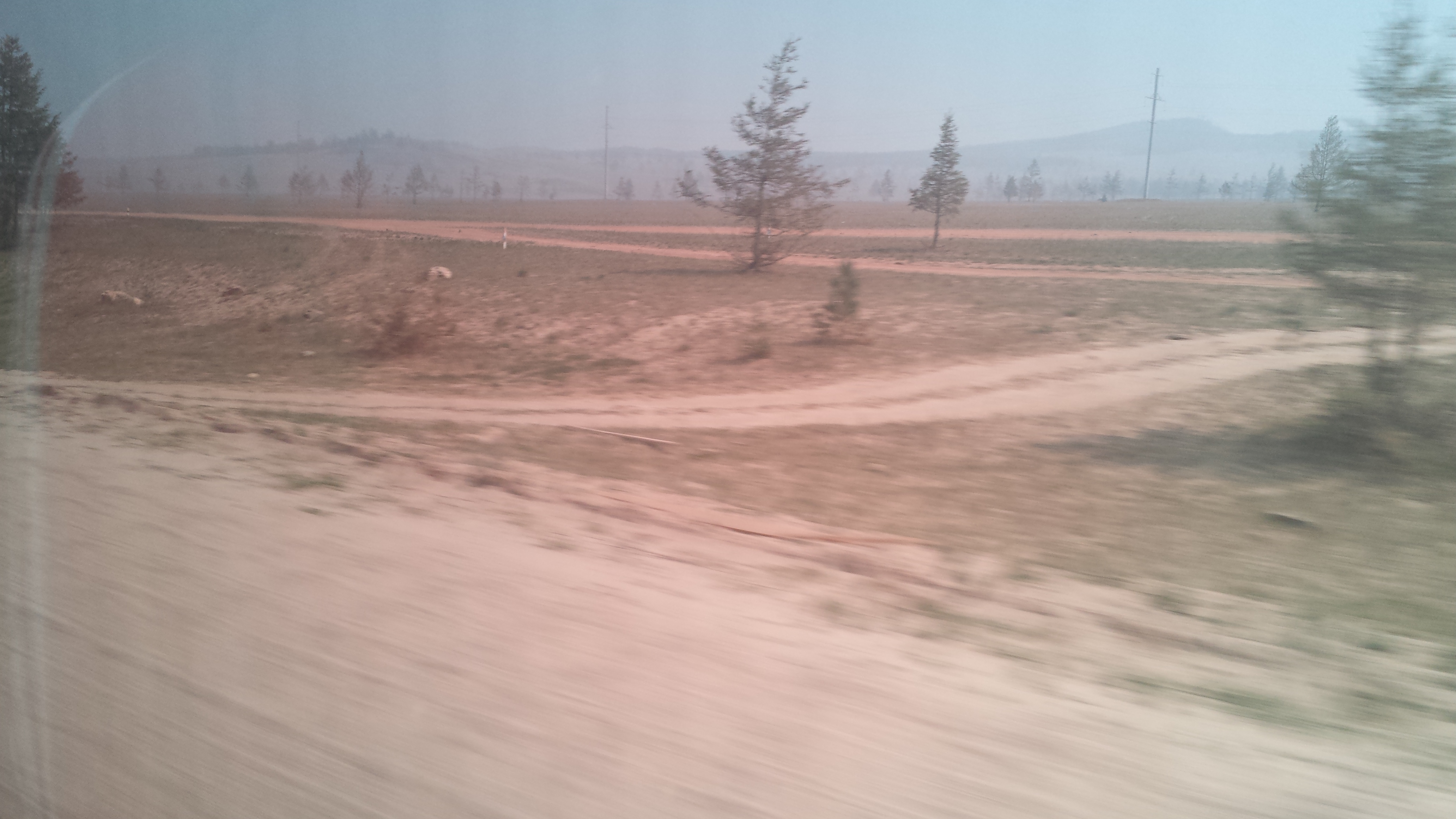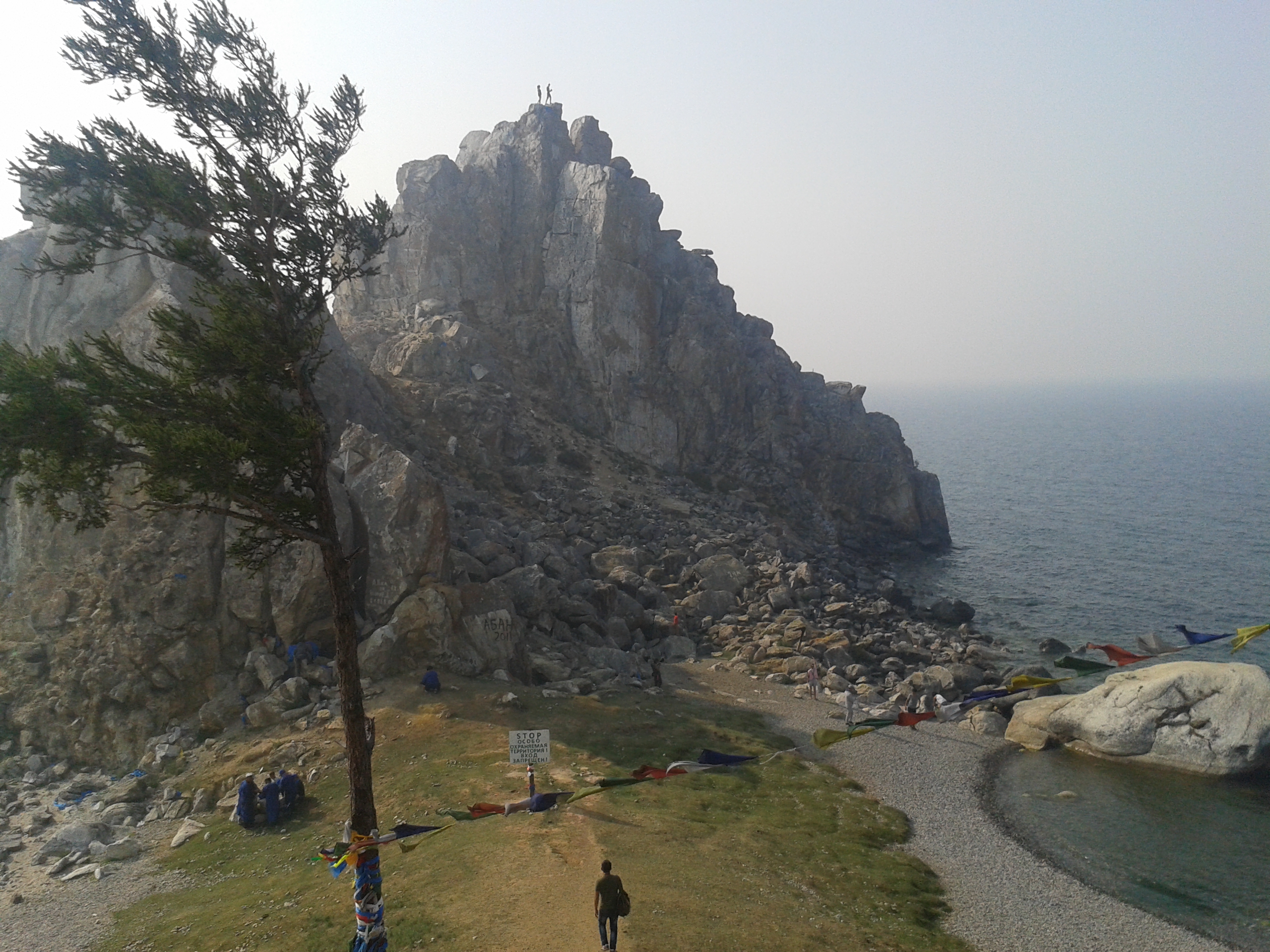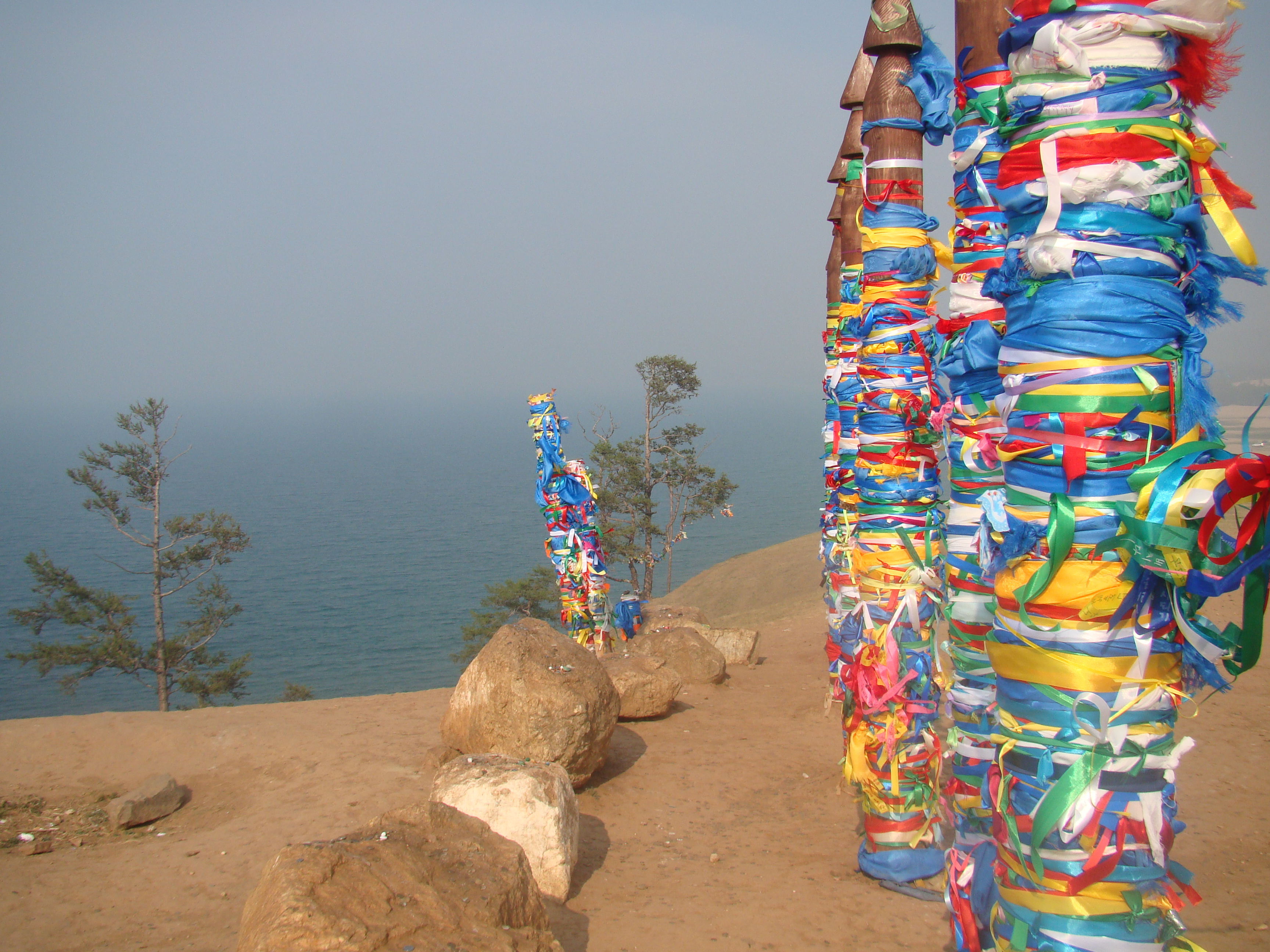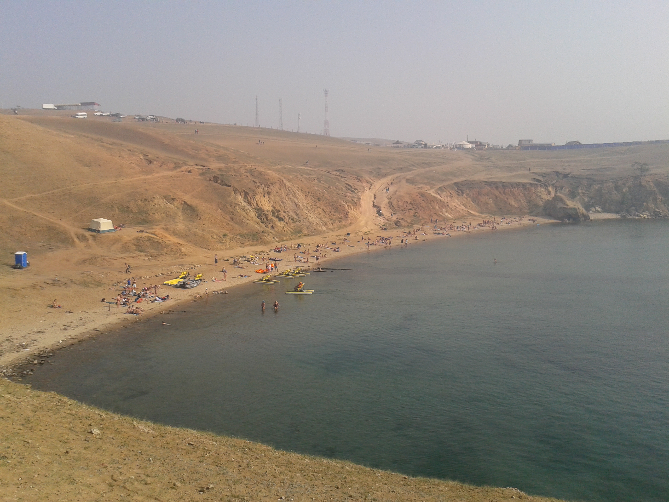 Die weitere Fahrt führte unseren Bus durch karges Gelände, bis 50km vor der Insel gab es noch asphaltierte Straßen, danach ging es weiter über Schotterpisten. Die Landschaft gleichte auch eher einer bergigen Wüste. Bäume gab es nur sehr wenige und diese, die an den Hängen standen, hätte man denken können, würden zerhackt und in Deutschland in großen Tüten als Grill-Holzkohle verkauft. Es lag eine Art Rauch in der Luft, leicht nach verbranntem Holz riechend aber nicht stark genug im ein Brand sein zu können. Mit großer Erleichterung wurden bald erste Ufer des Baikalsees hinter den Hügeln sichtbar.