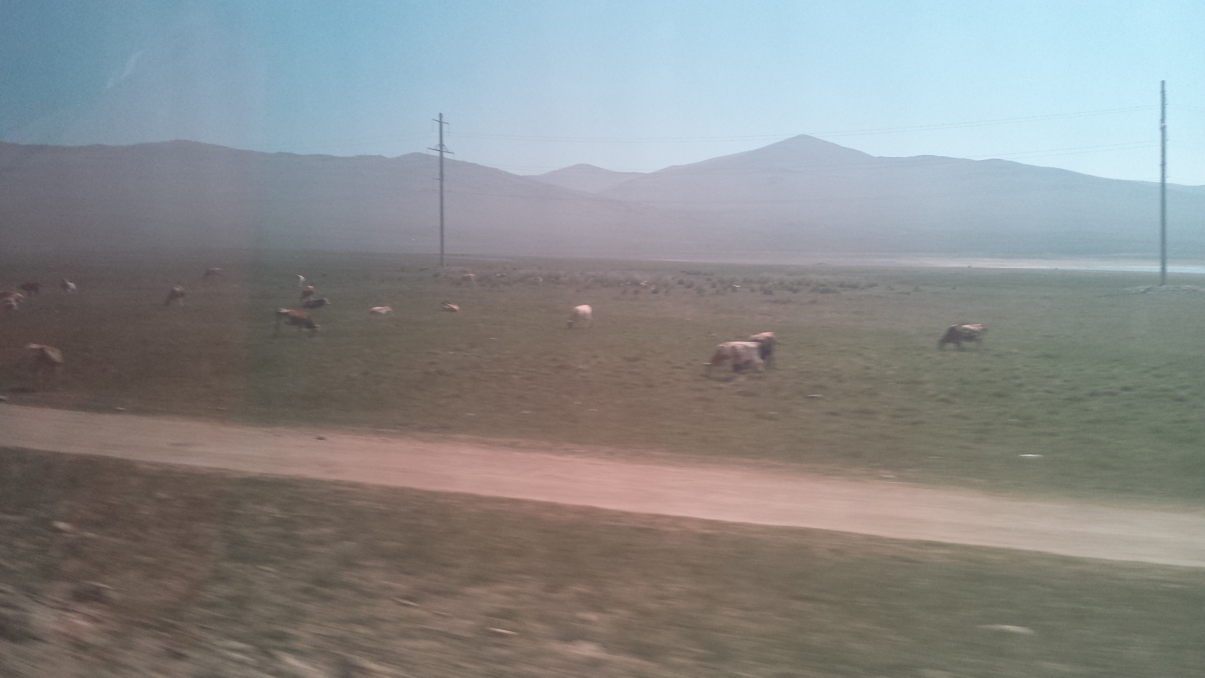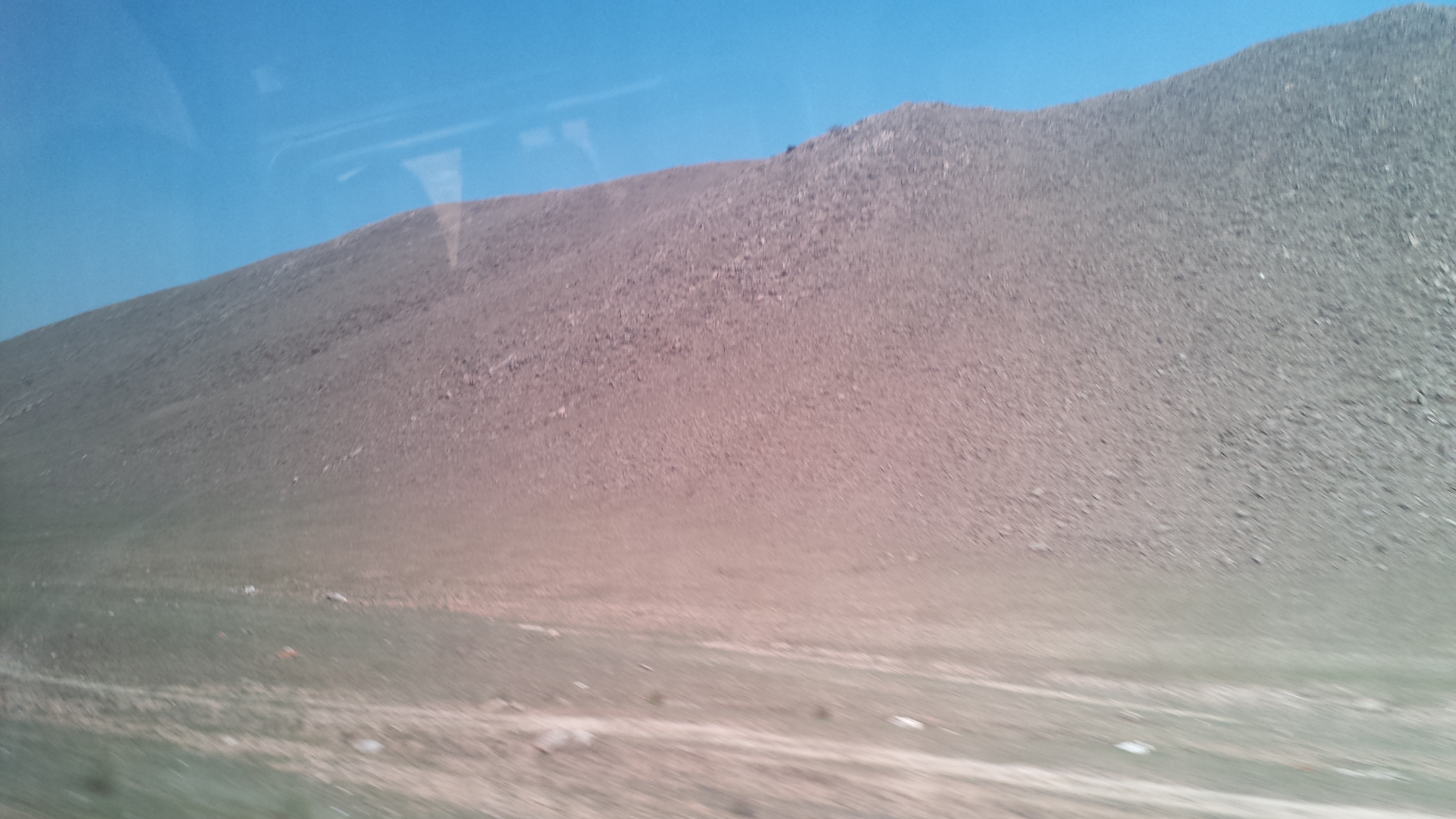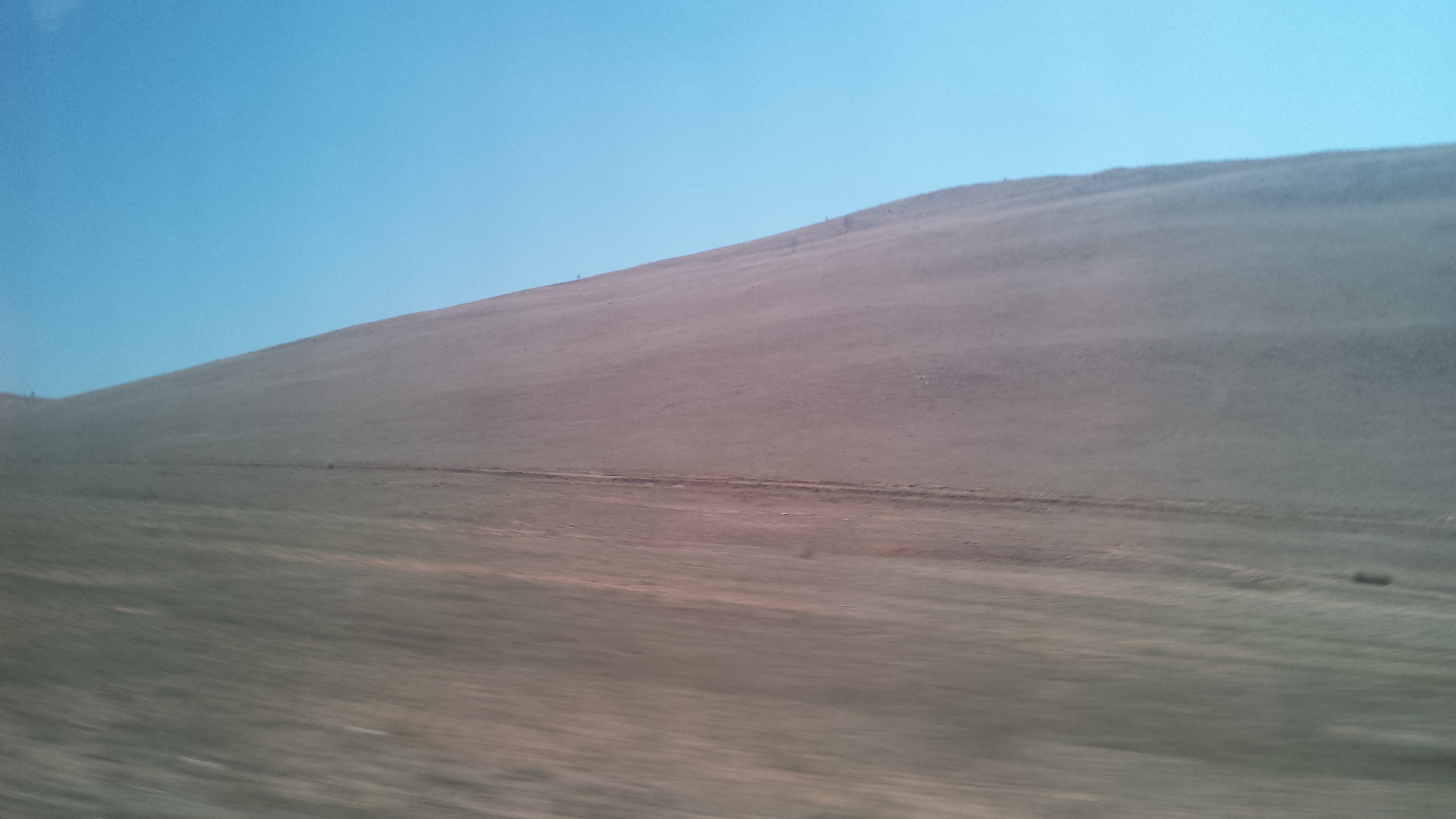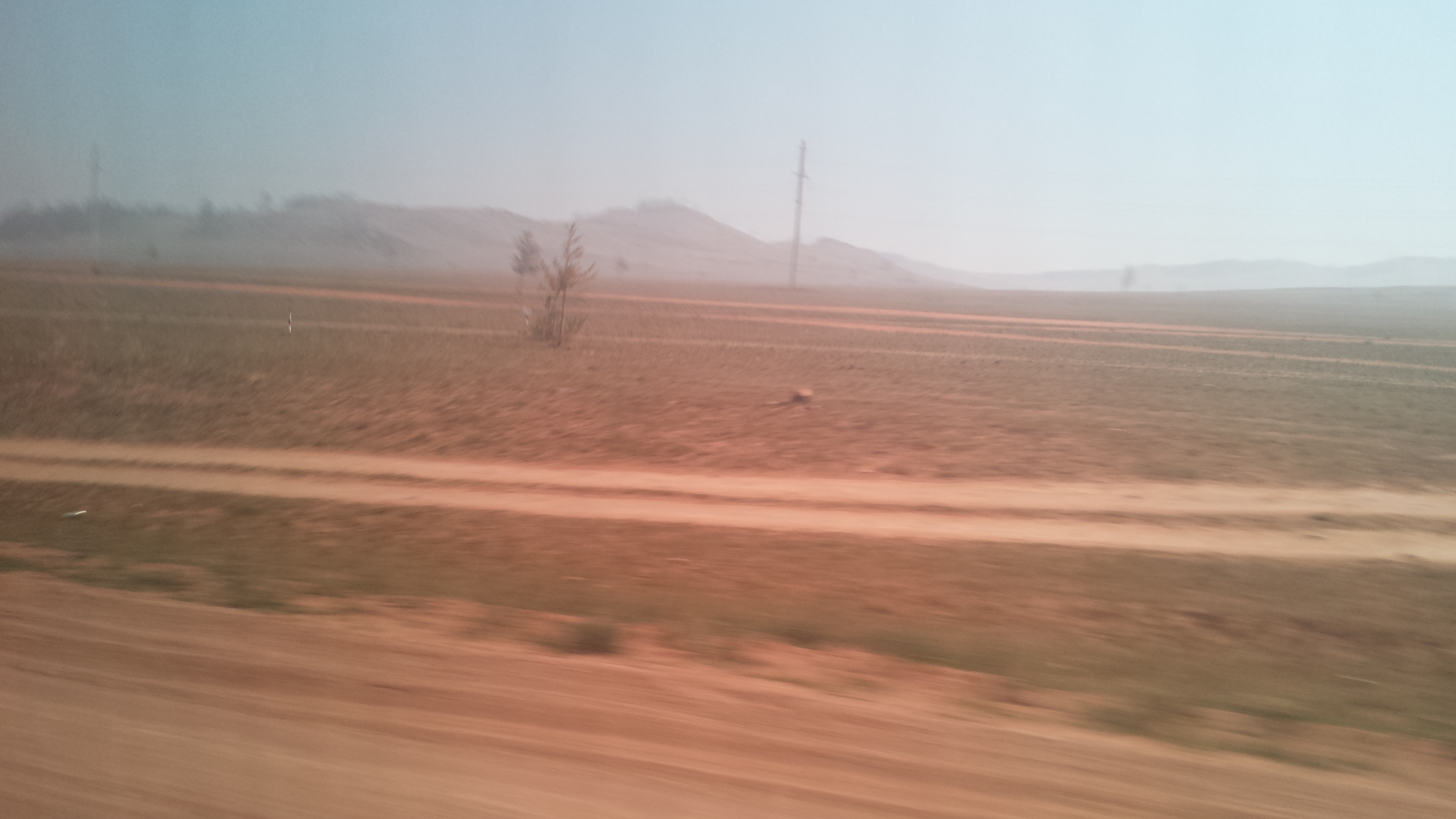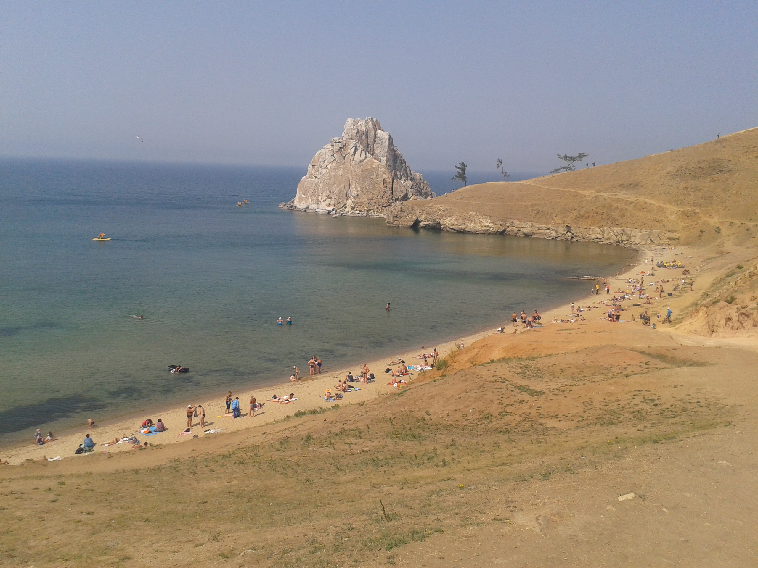 Die weitere Fahrt führte unseren Bus durch karges Gelände, bis 50km vor der Insel gab es noch asphaltierte Straßen, danach ging es weiter über Schotterpisten. Die Landschaft gleichte auch eher einer bergigen Wüste. Bäume gab es nur sehr wenige und diese, die an den Hängen standen, hätte man denken können, würden zerhackt und in Deutschland in großen Tüten als Grill-Holzkohle verkauft. Es lag eine Art Rauch in der Luft, leicht nach verbranntem Holz riechend aber nicht stark genug im ein Brand sein zu können. Mit großer Erleichterung wurden bald erste Ufer des Baikalsees hinter den Hügeln sichtbar.