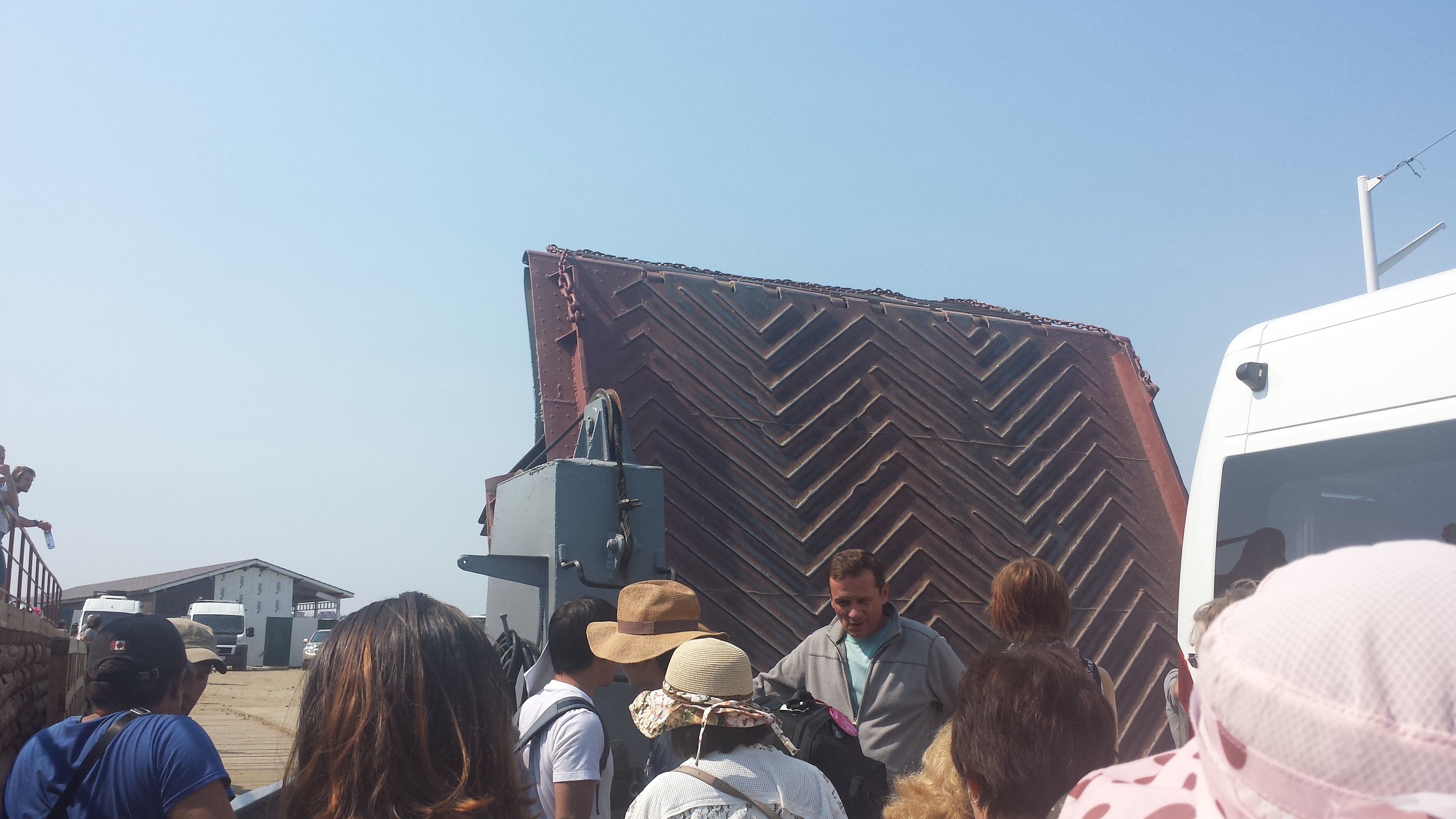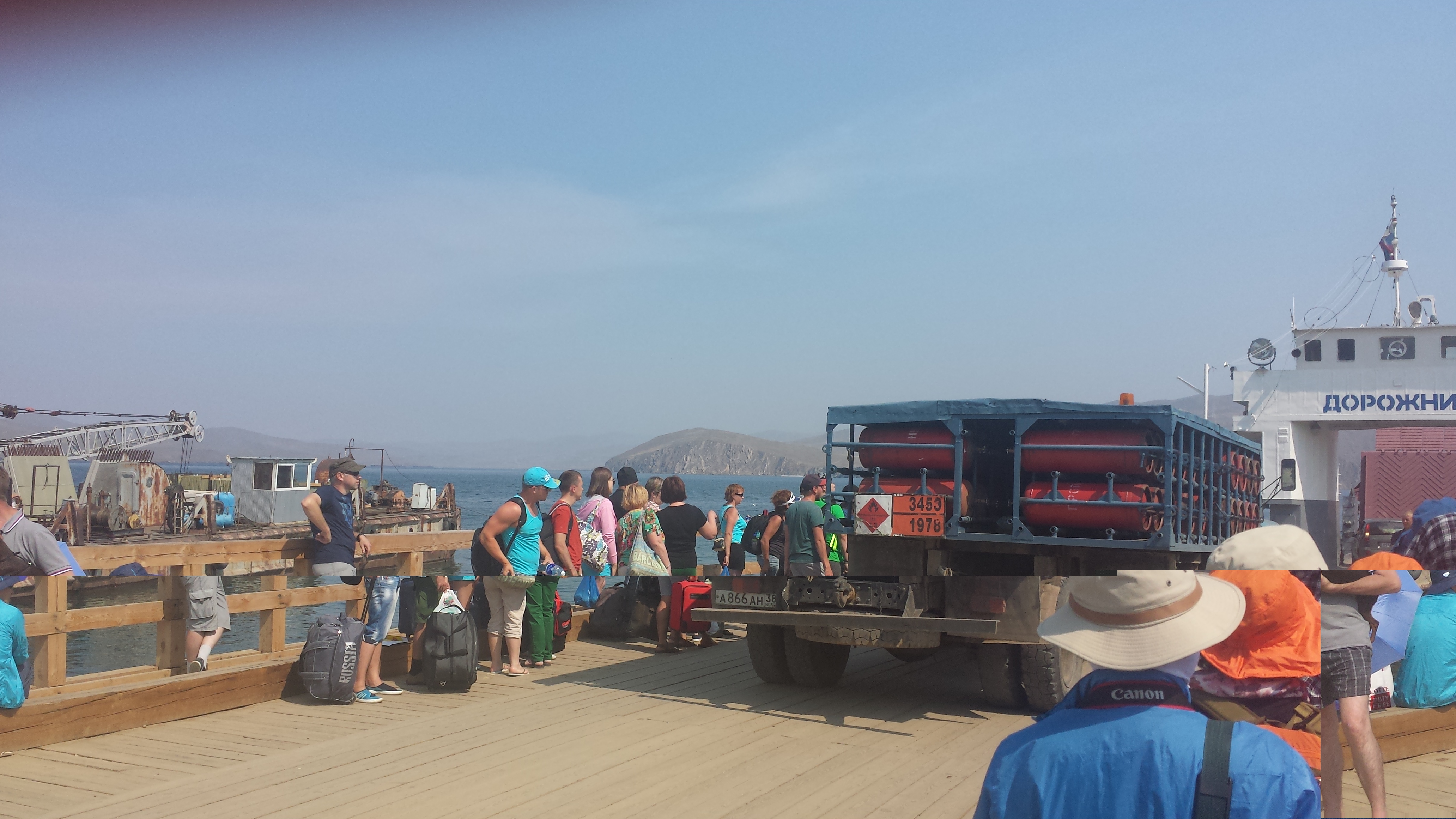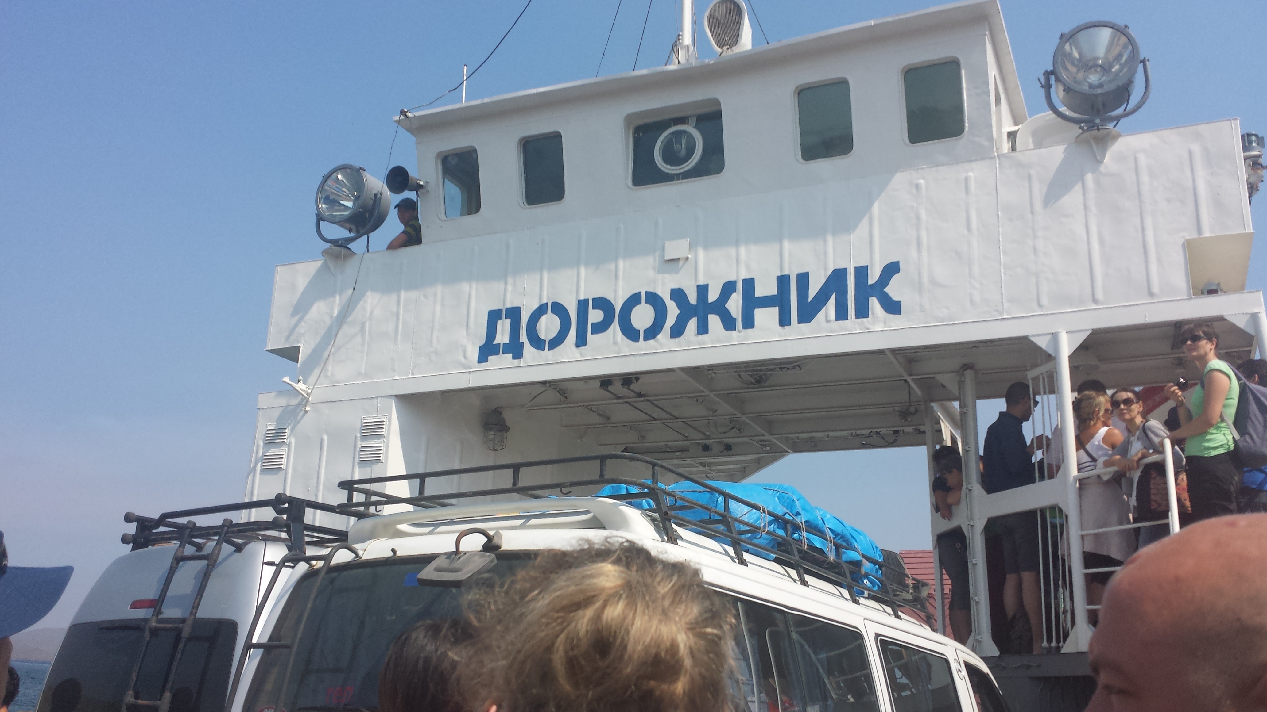 Als wir auf der Straße des Ende eines Staus erreichten war klar, dass diese ab hier auf die Fähre zur Insel Olchon warten. Unser Bus wurde aber vom Fahrer links an der Schlange vorbei auf einen kleinen Parkplatz für Busse gefahren. Anschließend ging es die letzten 150 Meter zu Fuß zum Fähranleger. Unsere Gruppe von Busreisenden marschierte zusammen mit allen anderen Zu-Fuß-Wartenden auf die Fähre nachdem einige größere Autos aufgeladen wurden. Platz gab es dort nicht viel, aber die Fahrt dauerte auch nur etwa eine Viertelstunde.