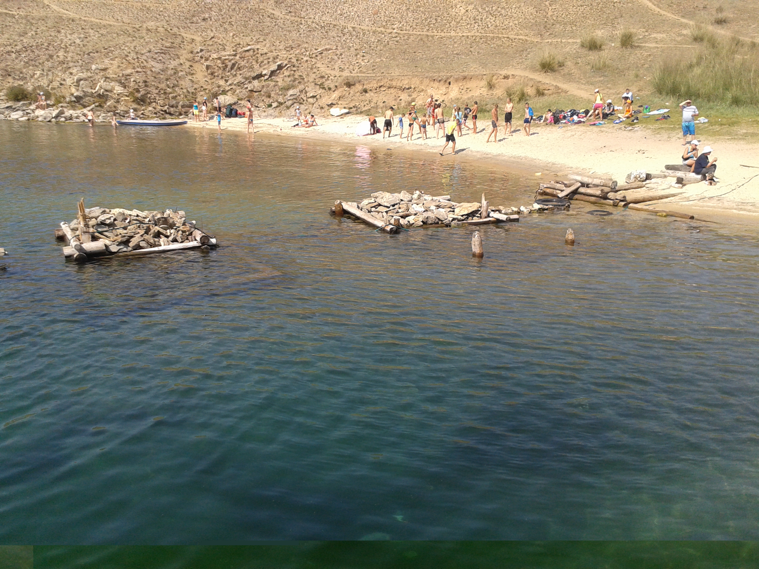 Nach dem Futtern schlenderten wir an einer der Hauptstraßen, die quer zum Dorf verlaufen, Richtung Wasser. Über sehr staubige Straßen hinweg – hier gab es keine befestigten Straßen – an deren Seiten es immer wieder kleinere Souvenir-Jurten und Shops für Getränke gab, ging es auf einen Hügel zu. Von dort ging es mit Blick auf eine wunderschöne Bucht bergab. Die Bucht wurde durch zwei riesige Felsen begrenzt und auch am Strand selbst lag seiner dieser Brocken. Hier war es relativ voll, aber wir hatten den Willen einen Platz für unser Handtuch zu finden und somit war die Suche auch nach wenigen Minuten erfolgreich. Mein Eindruck hatte mich nicht enttäuscht. Dass es nicht sehr viele Menschen ins Wasser zog, hatte einen einfachen Grund: Es war kalt. Also nicht so eine kleine Abkühlung, sondern richtig bitter eiskalt. Nach mehreren Minuten aber gewohnte ich mich langsam dran und man hätte es auch noch länger aushalten können. Zum Glück wärmte einen die Sonne beim Rauskommen wieder ordentlich auf und nach schnellem Abtrocknen ging es schon wieder. Wir gammelten noch eine ganze Weile am Strand rum, bevor wir uns, diesmal auf einen noch steileren Weg in die Richtung des großen Felsens wieder den Hand hinauf machten.