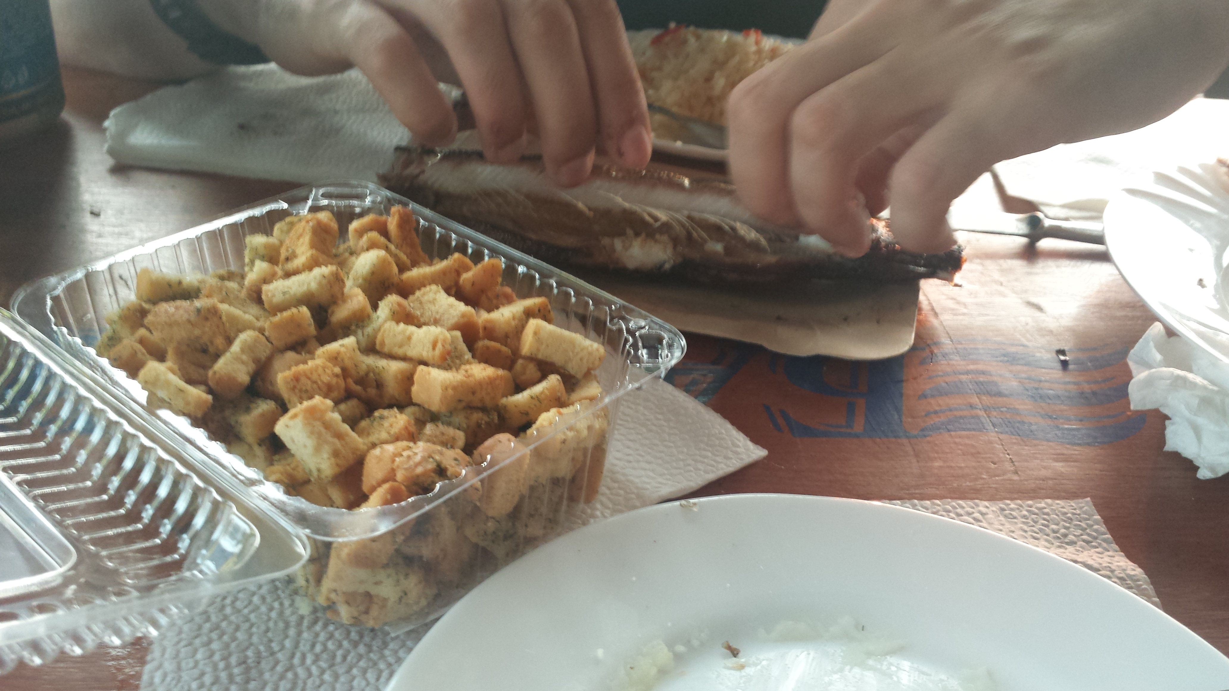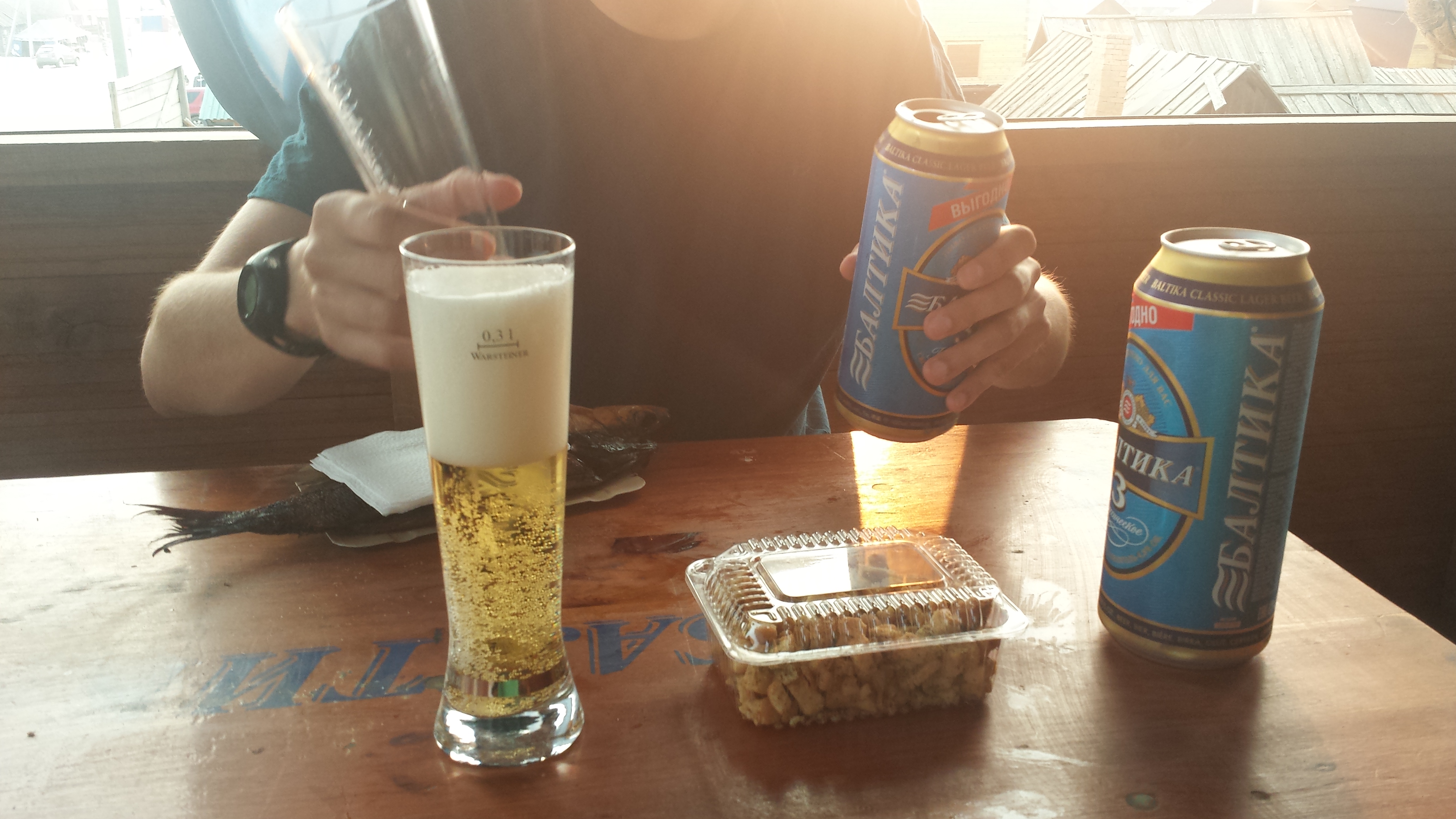 Da wir noch keine Lust hatten in den Verschlag zurück zu kehren, steuerten wir eine Futterstelle an wo es Omul in geräuchterer Form gab. Das ist ein Fisch, den es im Baikalsee gibt, nur im Baikal. Zum Fisch dazu gab es wieder Knabberbrot (also trockendes Brot in Würfelform) und das klassische Baltika No. 3 in der handlichen 1-Liter-Patrone. Davon gabs aber erstmal für jeden eine, damit wir den heutigen Schock verarbeiten konnten. Der Fisch war n bisschen zu geräuchert, aber trotzdem sehr lecker. Das Bier war auch okay und zum Glück noch kalt.