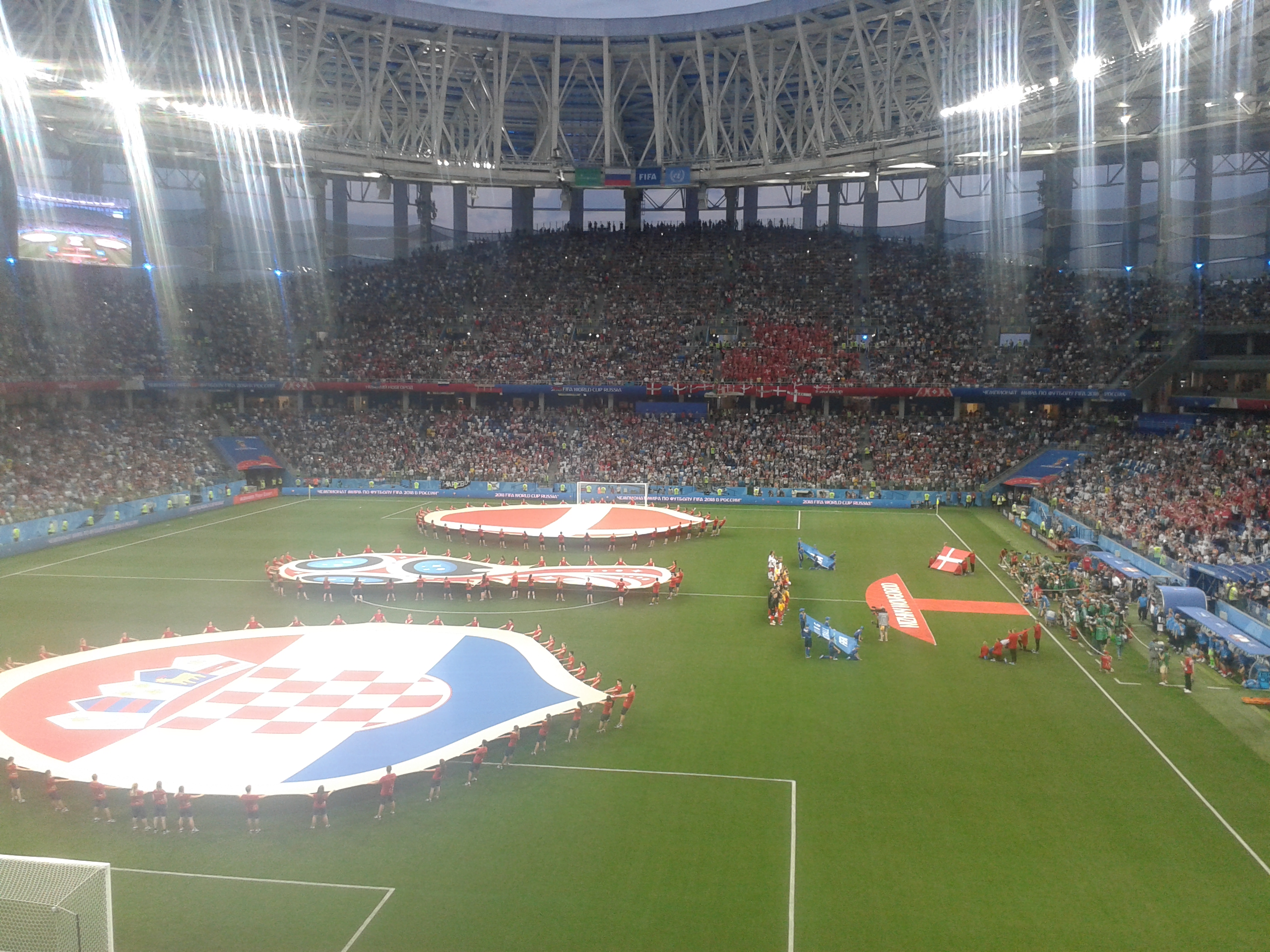 Danach wurde es Zeit für uns, zum Stadion aufzubrechen. Per Auto wurden die drei Minuten zur Metro überbrückt, also die 3 Minuten, die wir per booking.com zu Fuß hätten von der Metro weg sein sollten. 50 Meter vom Eingang wurde ein PArkplatz gefunden und die Fahrt ging erneut bequem und kostenlos per FanID. An der Station vom Stadion angekommen, folgten wir der Beschilderung, die uns anders als beim letzten Besuch, einen elend langen Weg um das örtliche Möbelhaus herum führte. Mit ziemlicher Sicherheit bekommen dieses und die Umgebung keine Bestnoten. Auch die Musik aus den Megafonen der Voluntäre konnte diese Ansicht nicht bessern. Zum Spiel schafften wir es recht knapp, obwohl die Kontrollen erträglicher als in Kazan waren. Unsere Plätze im Stadion waren top, direkt hinter dem Tor, nahe des kroatischen Mob mit bester Sicht aufs Spielfeld. Die Dänen saßen auf der anderen Hintertorseite, geordnet als roter Haufen und waren kaum akustisch zu vernehmen. Die Kroaten legten gut los, fingen sich aber schnell ein dummes Tor ein. Die Luft im Block war dadurch etwas raus, was aber die im Stadion verteiltn Argentinier für einige Liedchen nutzen. Das Spiel plätscherte nach dem Ausgleich vor sich hin Lediglich in der Schlussphase tat Kroatien etwas mehr, konnte aber den rausgespielten Elfer nicht machen und so gewannen sie das Spiel souverän im Elfmeterschießen. Wir hatten erneut eine kurze Nacht vor uns und beeilten uns, per Metro dann zum Auto und in die Wohnung zu kommen. Die Klamotten wurden für die Abfahrt gewordnet und noch eine Dusche genommen.